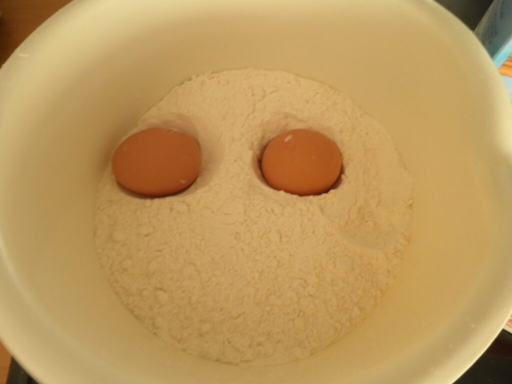 Doe de bloem in een grote kom en maak een kuiltje. Doe de eieren in dit kuiltje.