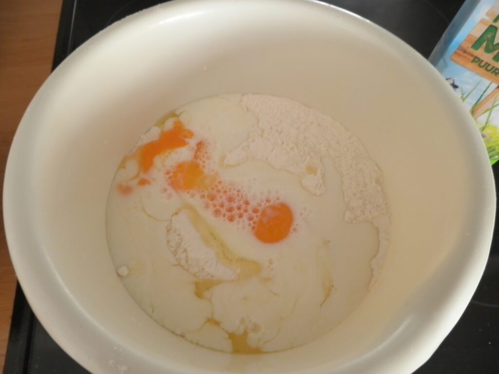 Dat ziet er beter uit! Voeg nu ook een mespunt zout, het zakje vanillesuiker en een scheutje melk toe.