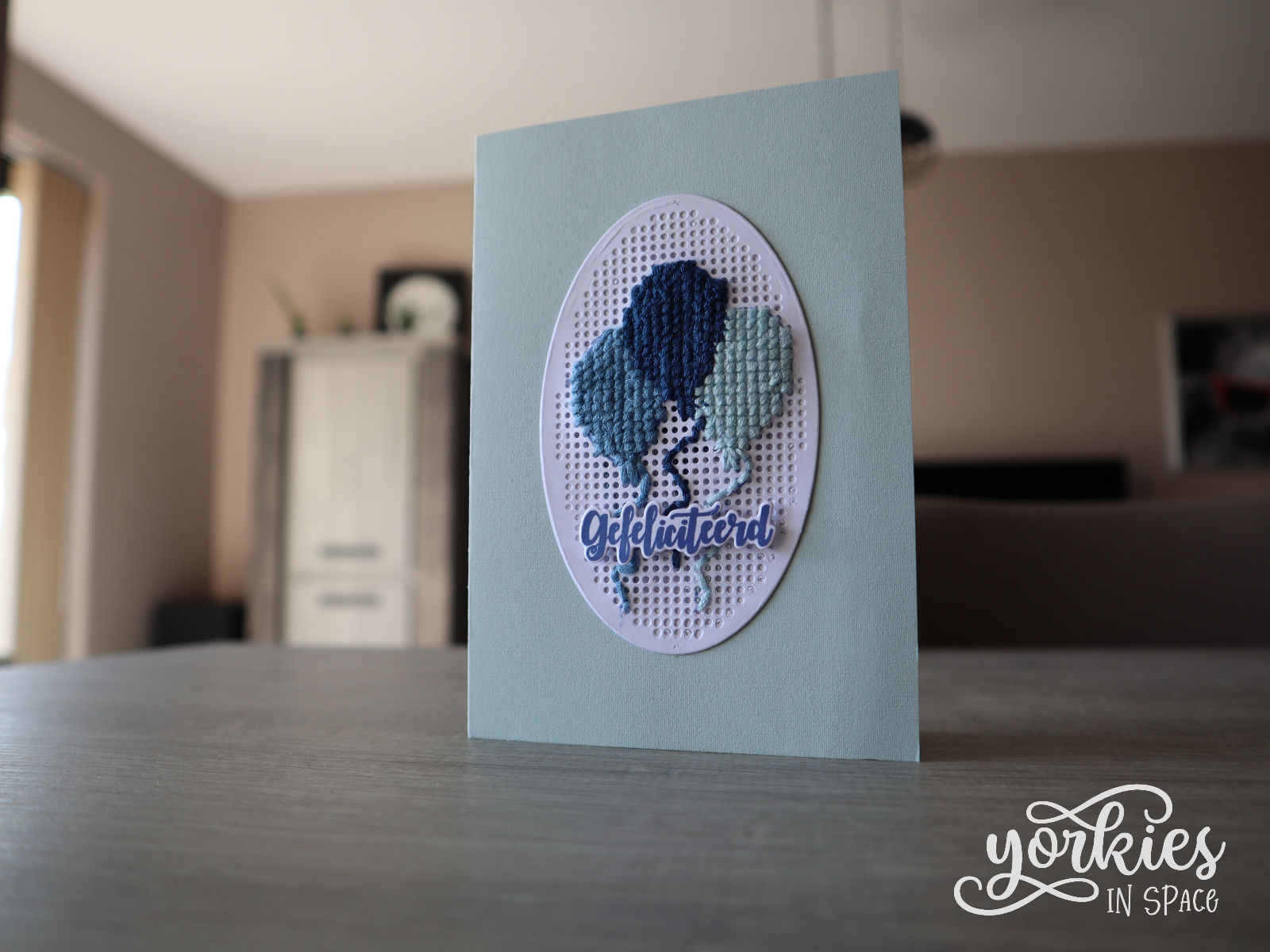 Omdat het borduren heel veel tijd kost, en ik wil dat het de focus van de kaart blijft, koos ik ervoor om het kaartje verder heel simpel te houden. Ik sneed nogmaals de witte ovaal uit, zonder gaatjes deze keer, en plakte het element met de ballonnen daarop. Dat kleefde ik op een lichtblauwe kaart. Om af te werken voegde ik nog een gefeliciteerd van Carlijn Design toe met foamtape.