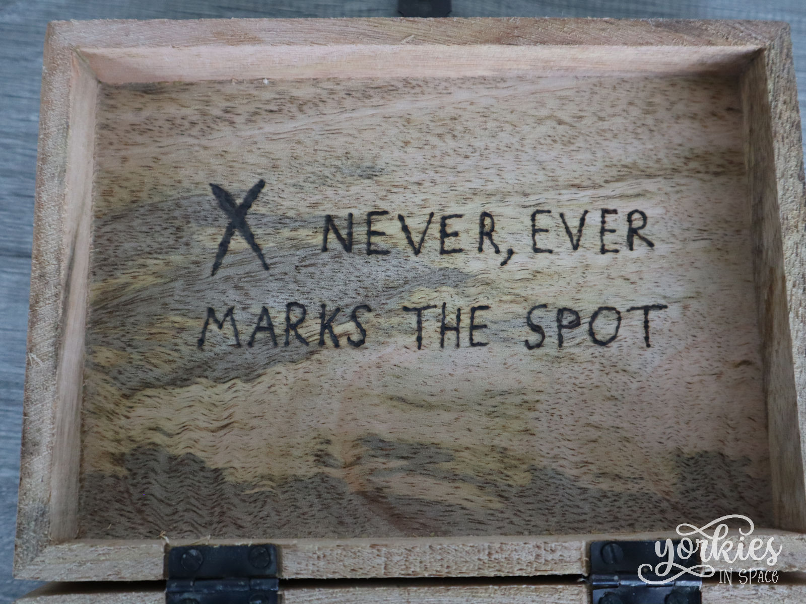 Mijn eerste idee was om op het deksel van de kist een grote X te zetten, en dan in klein de rest van de quote. Maar toen ik het idee aan mijn partner toonde, dacht hij meteen aan het nieuwe Twitterlogo. Niet bepaald het beoogde doel dus! Hij kwam met een veel leuker tegenvoorstel: een schatkaart op het deksel, en de quote aan de binnenkant.