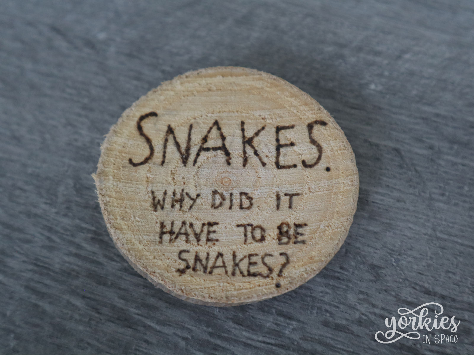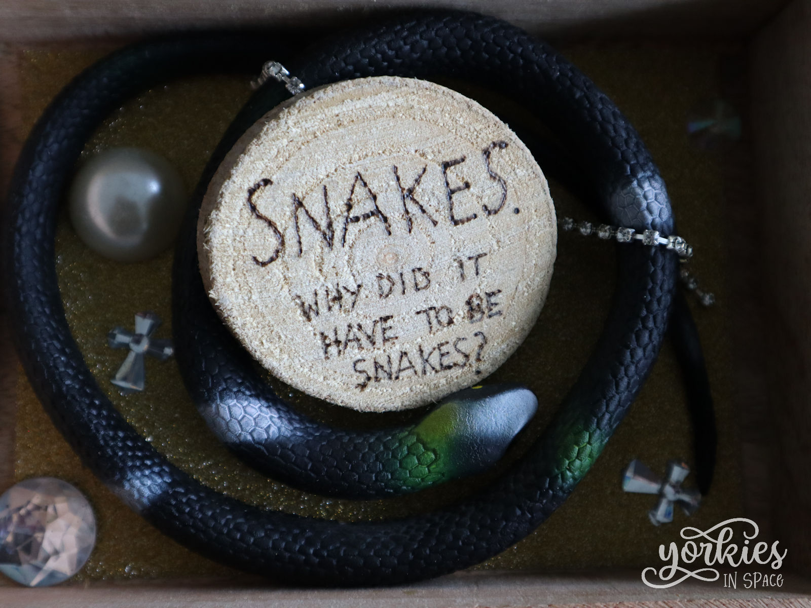 Voor de binnenkant had ik al de slang, maar ik wilde er nog een tweede quote plaatsen: Snakes, why did it have to be snakes?. In plaats van het in het kistje zelf te branden, nam ik een houten schijfje. Want als je het kistje ergens anders voor wilt gebruiken, en dus de slang eruit haalt, dan past die quote niet meer zo goed in het geheel.