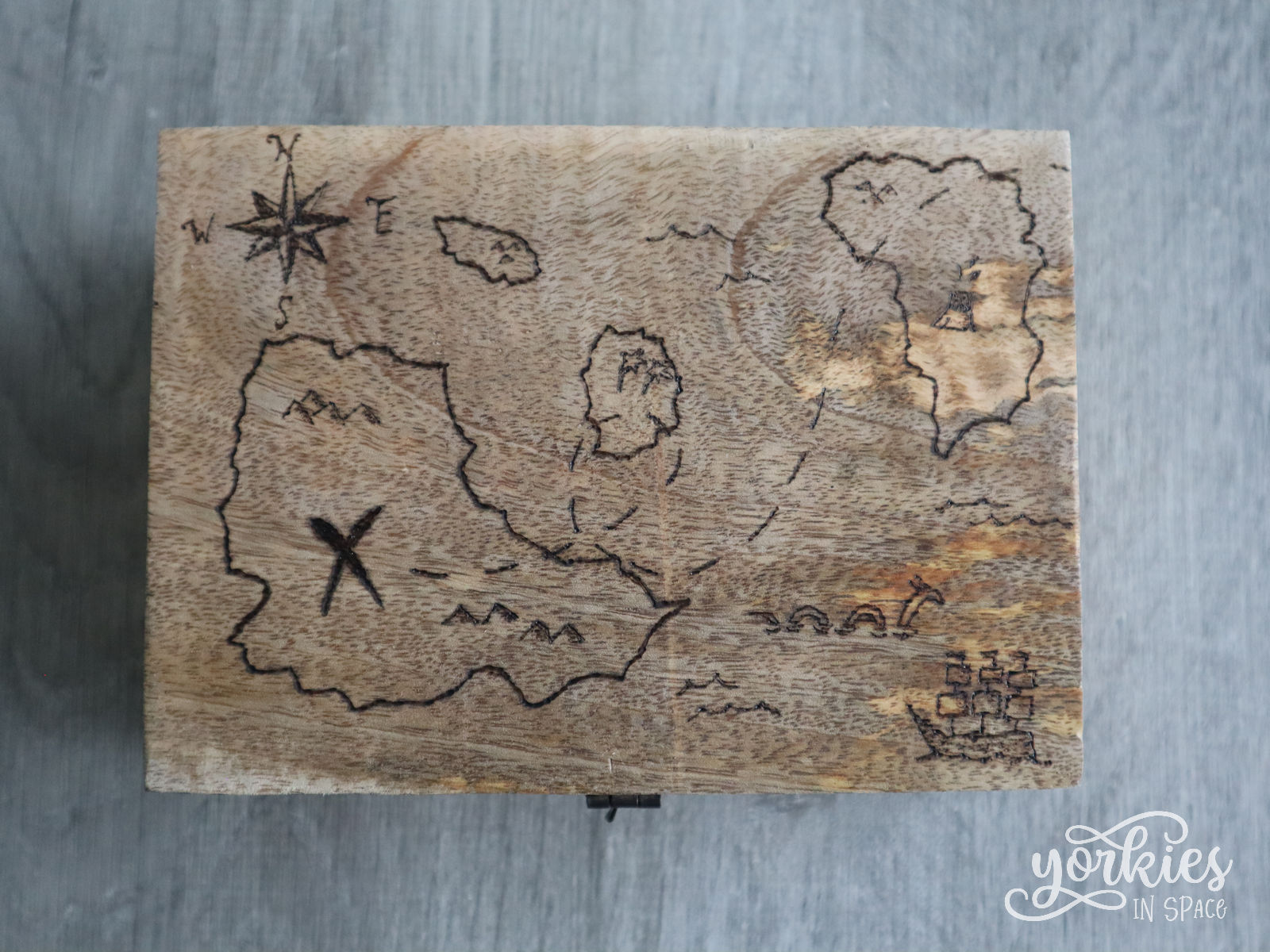 Na verschillende versies van een schatkaart op papier te tekenen, vond ik eindelijk eentje waar ik tevreden mee was. Ik had echter geen zin om die volledig opnieuw te tekenen op de kist, dus zette ik die over met carbonpapier. Dus een goede houtbrandtip:
