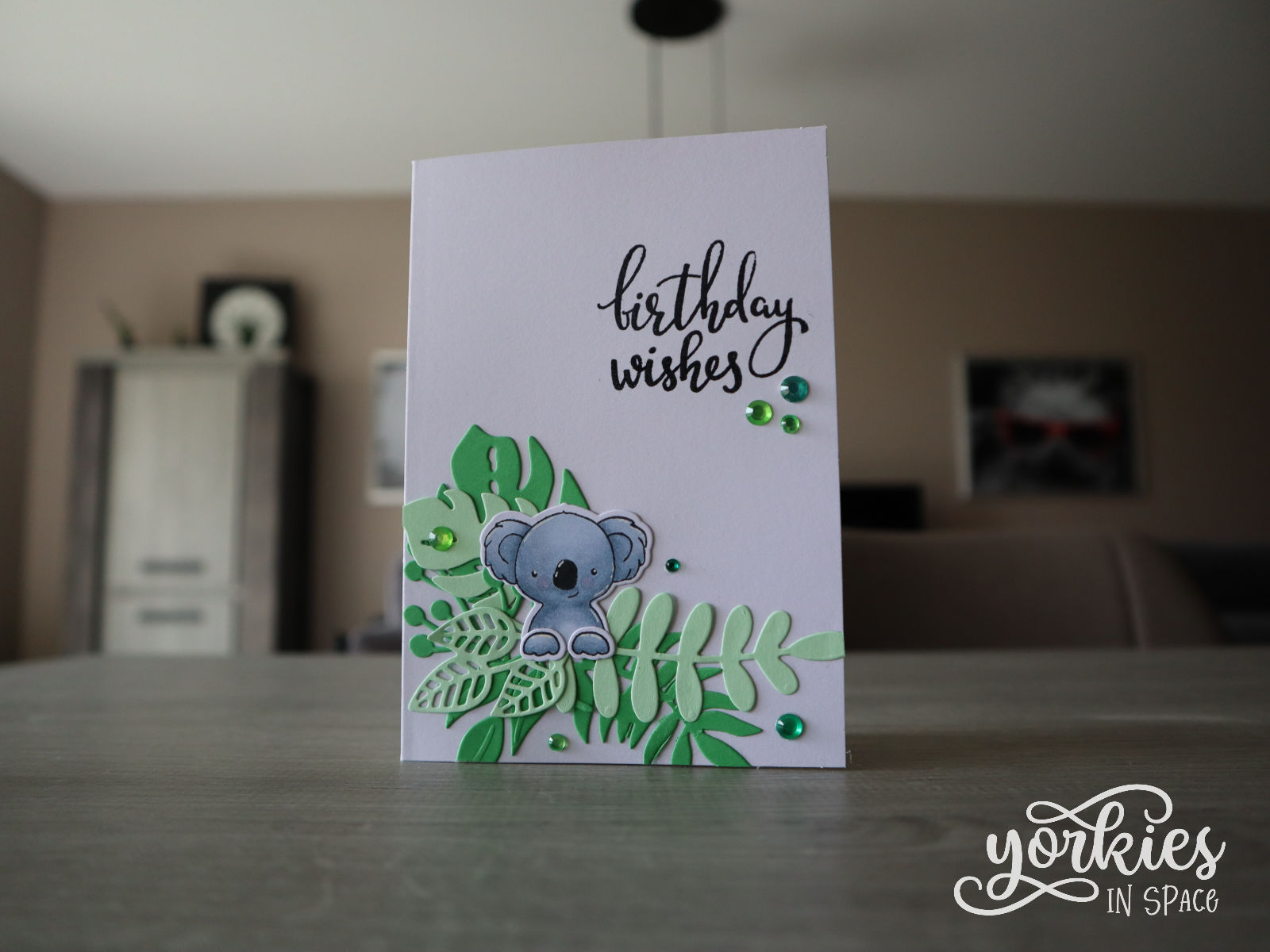 Voor het voorbeeldkaartje maakte ik een cluster van alle blaadjes, in twee tinten groen. Ik kleefde dat cluster linksonder op mijn kaartje, en plaatste er een koala in van Hello Bluebird. Ik stempelde een verjaardagstekstje en voegde wat groene embellishments toe om af te werken. Een snel kaartje dus!