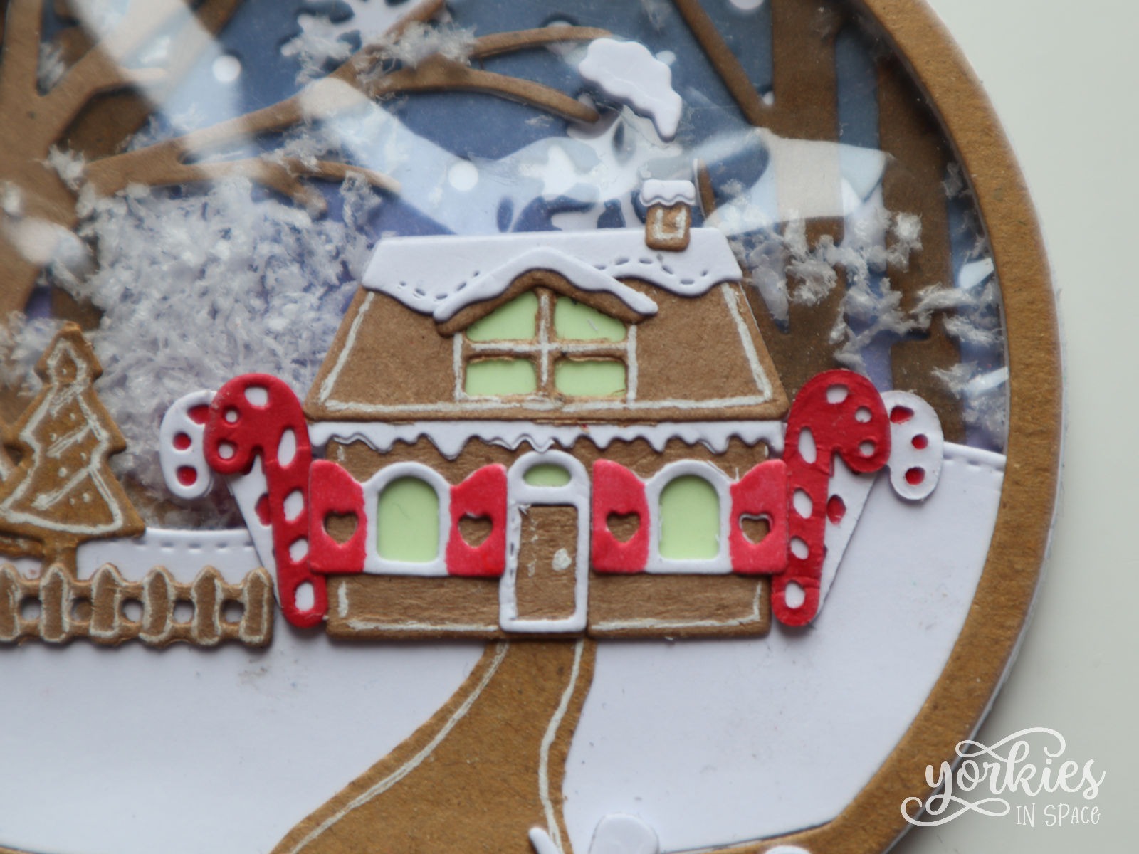 Het huisje werd al snel een peperkoeken huisje, om in kerstthema te blijven. Door het huisje uit kraft papier te snijden en er dan met een witte gelpen op te tekenen, heb je heel snel een peperkoeken huisje. Het deed me denken aan Hans & Grietje, dus besloot ik om de volledige snowglobe in thema van het sprookje te maken. Om het extra bijzonder te maken gebruikte ik decoratiesneeuw om er een shaker van te maken.