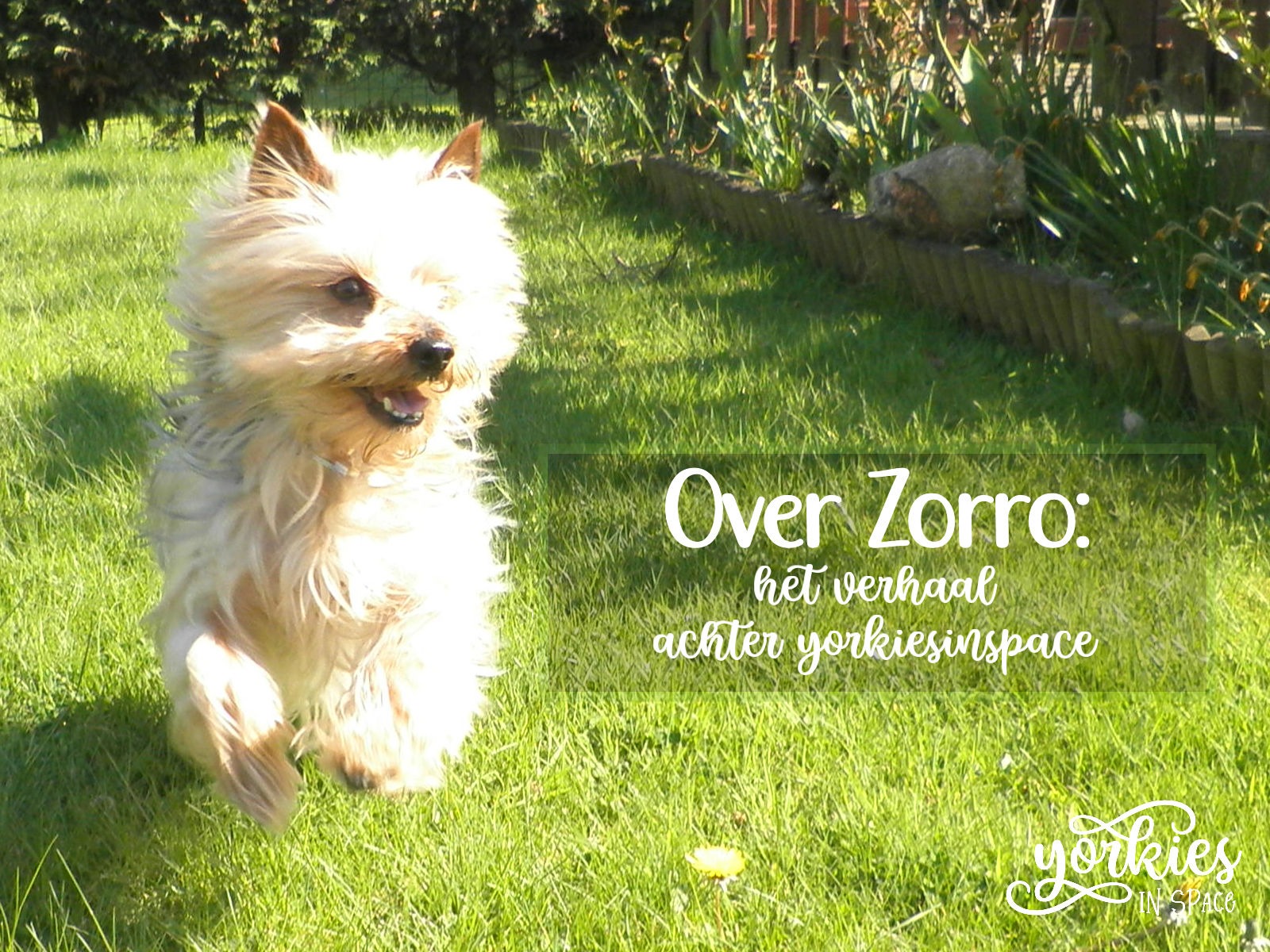 Waar komt de naam Zorro vandaan? Hij is niet eens zwart! Wel, toen we in 2005 een naam zochten voor puppy-Zorro, vond mijn vader het een leuk idee om hem een naam te geven van een held of een God. Yorkshire terriërs zijn namelijk kleine hondjes, en het contrast met zo’n naam is dan wel grappig. Puppy-Zorro was wél zwart en bovendien is Zorro Spaans voor ‘vos’, dus dat vonden we wel een leuke naam. De zwarte kleur van Zorro is niet blijven hangen, maar zijn naam wel.