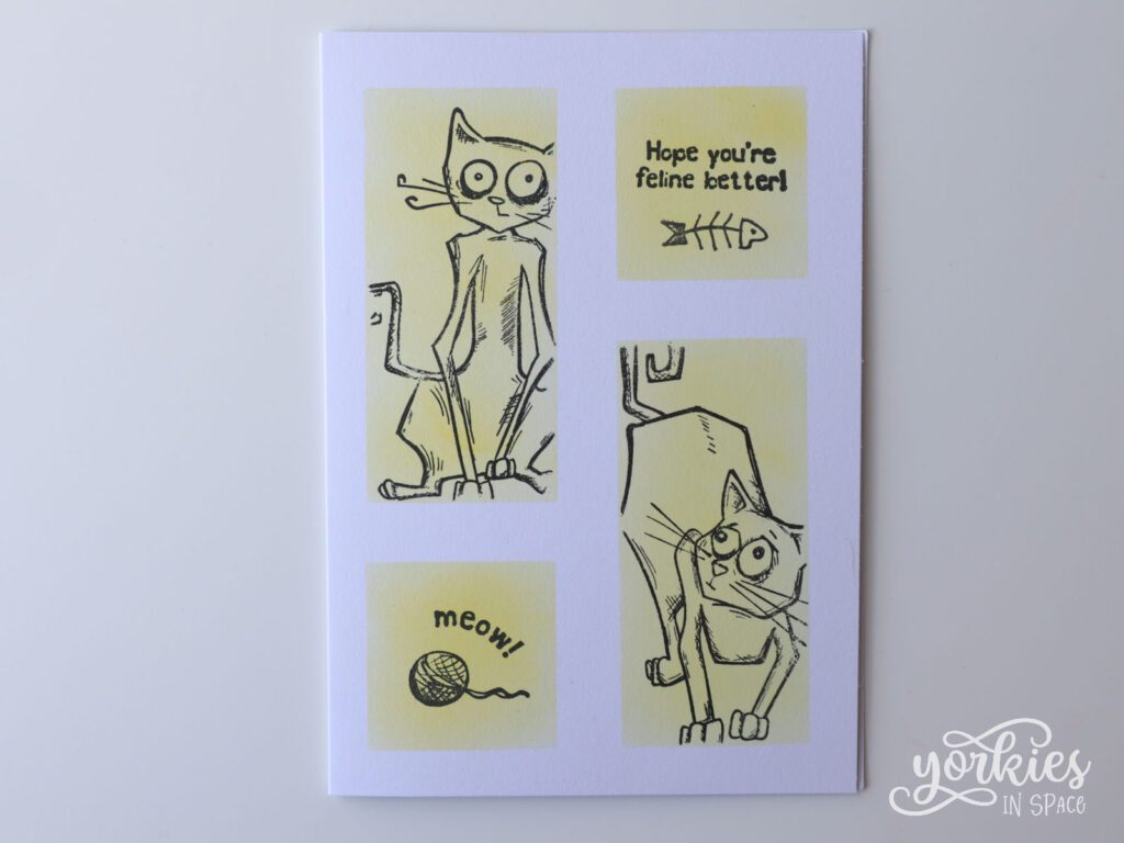Deze katten hebben dingen gezien die we ons niet kunnen voorstellen, ik vond ze echt leuk voor een beterschapskaart. Ook hier zie je dat de katten groter zijn dan de hokjes, maar dankzij de stencil flink binnen de gele hokjes blijven.