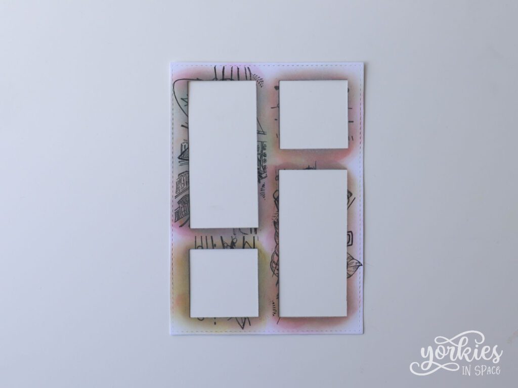 Ik gebruikte deze set van Avec Creative om daarmee een stencil te maken. De stencil is gewoon een A6-rechthoek, met daaruit twee rechthoeken en vierkanten gesneden. Als je niet exact deze set snijmallen hebt, heb je misschien wel andere rechthoeken of vierkanten waarmee je een gelijkaardige stencil kunt maken.
