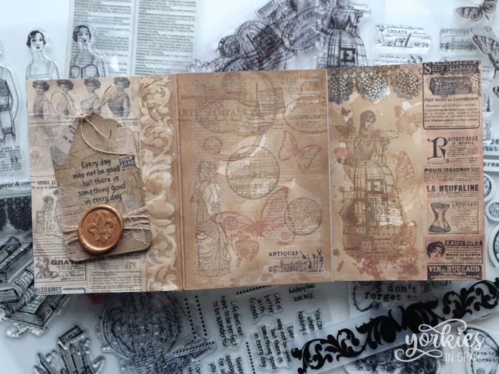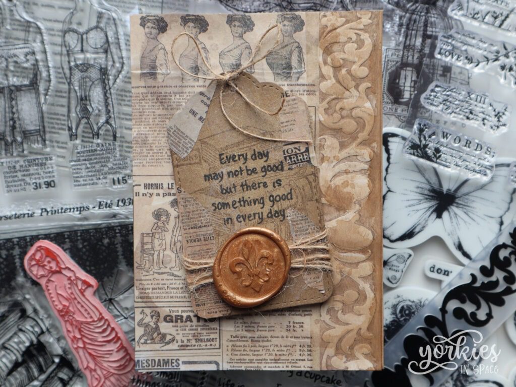 - Ga voor een nog meer mixed media kaartje door er van alles op te plakken. Ik heb het nog redelijk braafjes gehouden met koffie, een waszegel, touw en washitape. Maar je kunt er zoveel meer aan toevoegen! Denk aan oude postzegels of tickets, oude foto’s, krantenknipsels… Je kunt zo gek gaan als je wilt!