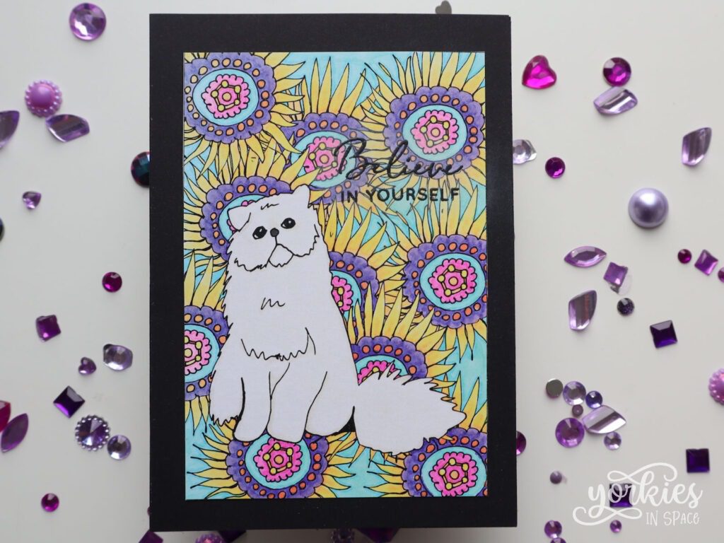 • Als je niet vies bent van fussy cutting, print dan de kleurplaat meerdere malen op hetzelfde formaat. Knip eens de kat apart uit en kleef haar terug met foamtape op de plaat. Zo krijg je extra dimensie! Let er wel op dat je de kat inkleurt voor je haar met foam vastkleeft.
