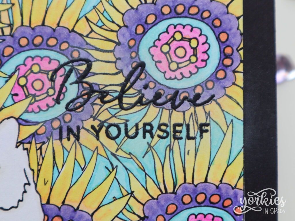 Voor het sentiment combineerde ik twee stempelsets die ik tweedehands kocht, vandaar dat ik van één ervan het merk niet ken. Ik gebruikte zwarte inkt en een clear gloss embossing poeder, en dacht dat de tekst wel goed genoeg zou uitkomen tegenover de achtergrond. Maar het resultaat was toch niet zo schitterend. Dus wreef ik wat witte inkt rond de tekst (je wrijft die gemakkelijk terug weg van het embossing poeder!) om meer contrast te creëren.
