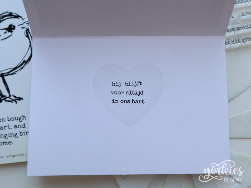 Het kaartje is natuurlijk voor Mamie, maar ook een beetje voor mezelf. Het was een emotioneel proces om het kaartje te maken. Door dat stukje in mijn hart bloot te leggen op de kaart, voelde ik me terug een beetje dichter bij Julien. Nu zit er ook een beetje van hem in de kaart, wat hij betekende voor mij, en leeft een stukje van zijn essentie zo een beetje voort.