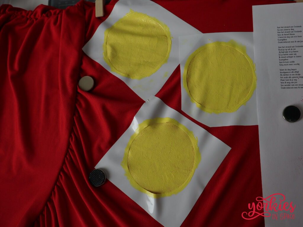 Voor de cirkels deden we hetzelfde met gele verf en simpele ronde stencils, alleen hadden die veel meer laagjes nodig om goed te dekken. Normaal gezien moest de poedel ook nog een lis krijgen. Maar om hiervoor een stencil te maken ging heel moeilijk zijn, en ik durfde het niet echt met de vrije hand te doen. Dus besloot ik om de lis achterwege te laten, de rok was zo al heel mooi.