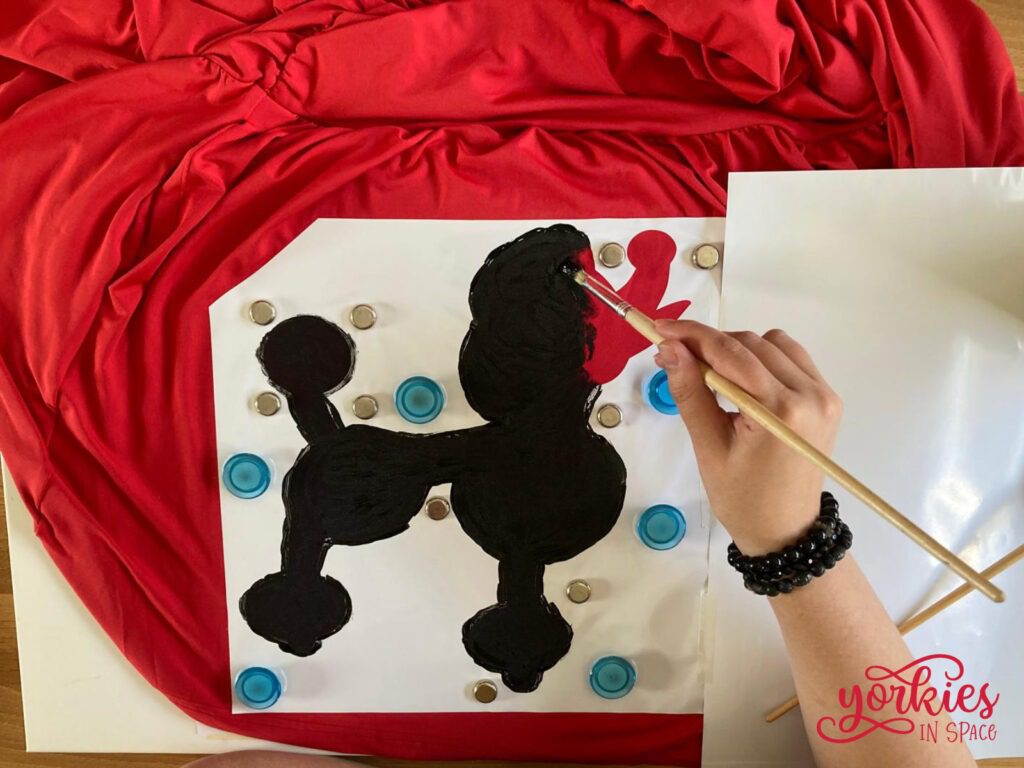 Met een cricut sneden mijn vrienden die dan uit vinyl zodat we die als stencil op de rok konden kleven, dat maakt het verven van de poedel een stuk gemakkelijker, en zorgde voor scherpe randjes. De magneten die je op de foto ziet is omdat we de rok zo plat mogelijk wilden hebben, zodat we de poedel er mooi effen konden op schilderen.