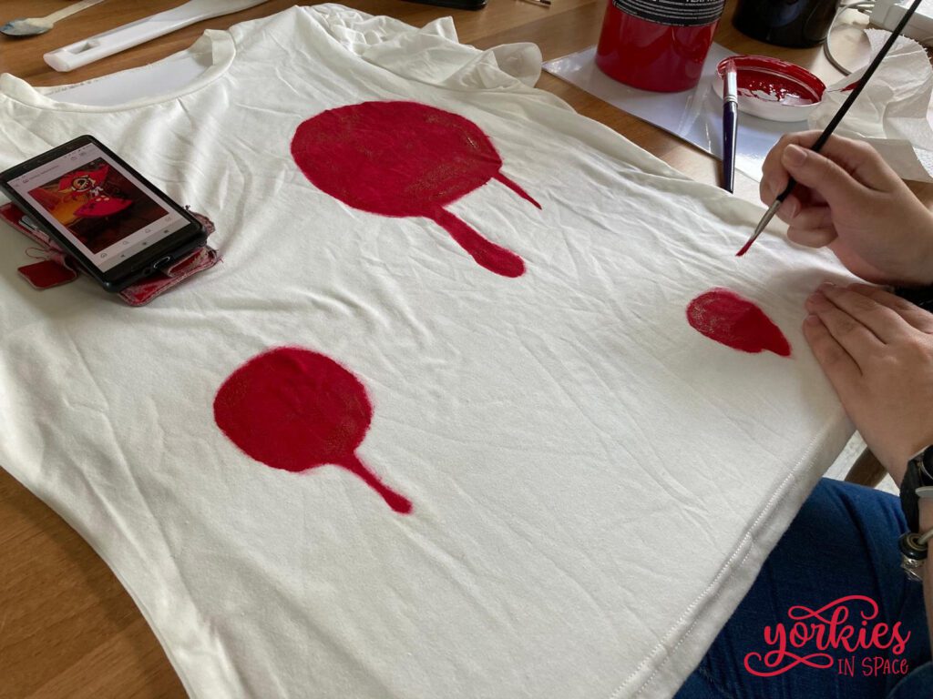 Ook de bloedvlekken op het T-shirt deden we met zeefdrukinkt, maar die schilderde ik gewoon met de vrije hand. Daar vond ik het niet zo erg dat de randjes niet zo scherp zijn, aangezien het bloedvlekken voorstellen.
