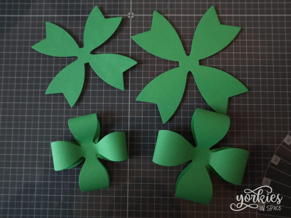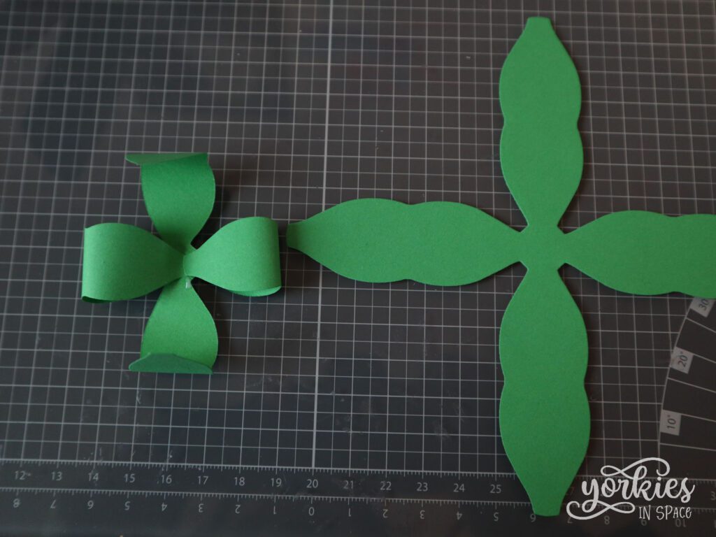- Krul de ‘beentjes’ van de uitgesneden stukken die de strik gaan worden. Dit zijn de stukken met afrondingen. Lijm de uiteindes in het midden. Het is handig om die per twee te doen. Zorg dat je telkens lang genoeg wacht totdat het droog is, zodat je niet alles terug per ongeluk uiteen trekt!