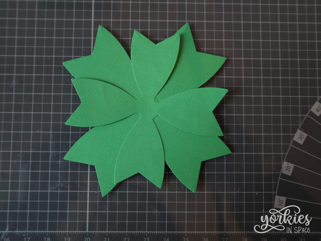- Nu kun je alle onderdelen op elkaar kleven. Ik draai ze telkens een beetje zodat ze scheef op elkaar plakken. Dat maakt de strik voller. Je kunt er ook voor kiezen om de onderdelen uit te lijnen voor een andere look.