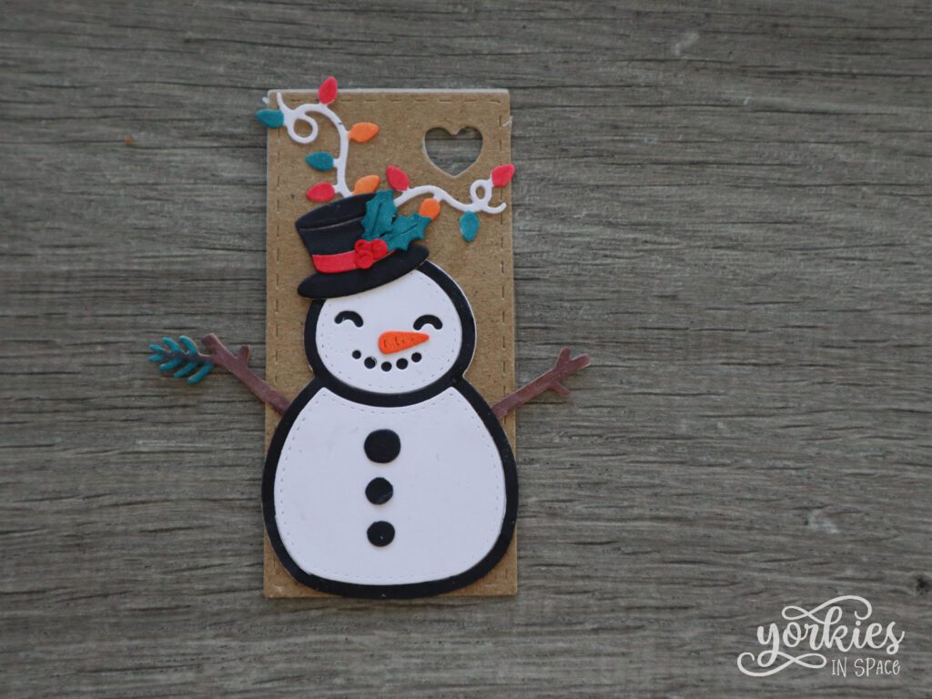 Voor het tweede labeltje koos ik voor een simpele rechthoek, met opnieuw een gat in de vorm van een hartje. Ik maakte de kleine sneeuwman met een hoge hoed, en een zwarte omranding deze keer. Met stiftjes kleurde ik de lichtjes in verschillende kleuren. Ik gebruikte de maretakbessen en de pompom als knoopjes.