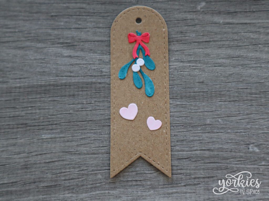 Ten slotte heb ik nog een labeltje zonder sneeuwpop, maar met enkel de maretak en twee hartjes. Dit keer wel gewoon in de vorm van een traditioneel cadeaulabeltje.