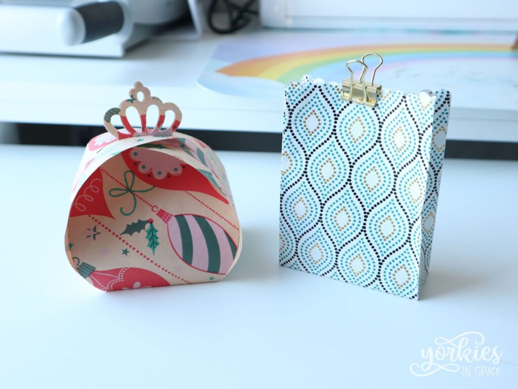 Dit idee lijkt op het eerste, maar is nog beter omdat je een herbruikbare cadeauverpakking maakt! Er bestaan veel snijmallen voor cadeaudoosjes of -tasjes, en met een snijplotter heb je nog meer mogelijkheden. Beide kunnen gewoon cadeaupapier snijden, net zoals gewoon papier! Let er wel even op dat cadeaupapier niet even stevig is als het papier waarmee je dit normaal zou doen. Je kunt dus ofwel gaan voor een niet-zo-stevige verpakking, ofwel je cadeaupapier eerst op steviger papier kleven voor je alles assembleert. Het hangt van je eigen voorkeuren af.