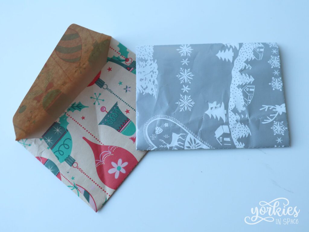 Let wel even op: ik zou deze enveloppen gebruiken voor bijvoorbeeld een cadeaubon of geldcadeau, maar niet voor een kaartje in de post. Enveloppen van cadeaupapier zijn namelijk veel minder stevig dan gewone enveloppen. Ook hier kun je het oplossen door het cadeaupapier op ander papier te kleven, maar hou het gewicht van je envelop dan in de gaten zodat je geen boete krijgt omdat er niet genoeg postzegels ophangen. Vergeet ook niet dat het adres goed leesbaar moet zijn, dus die kun je dan best op een sticker schrijven/printen en op de envelop kleven.