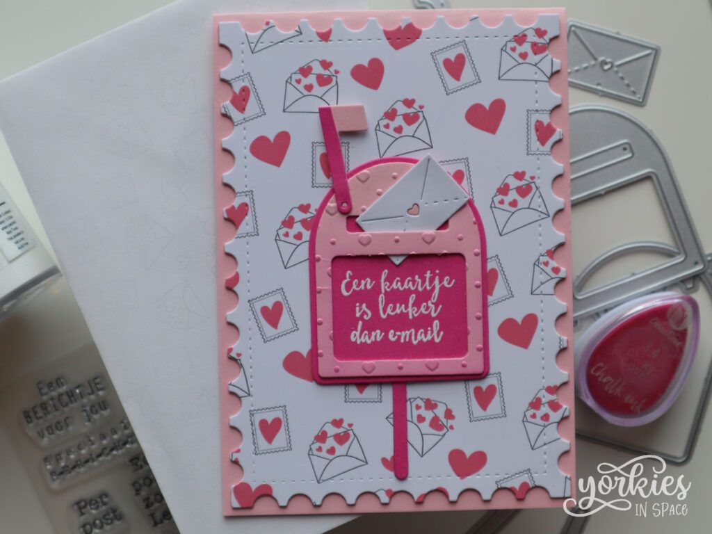 In mijn voorbeeldkaartje ging ik helemaal los op het post-thema. Ik gebruikte het patroonpapier als achtergrond voor een brievenbus. De print op de envelop is heel subtiel, maar voegt toch iets extra toe aan het geheel.