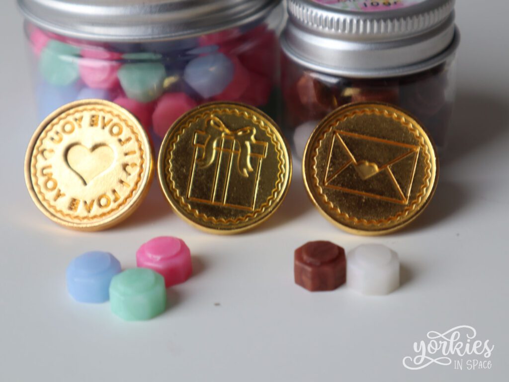 Er zijn drie verschillende sets, met telkens drie andere wasstempels, en andere kleurtjes was. Op de foto’s hieronder kun je zien welke kleurtjes en stempels in elke set inbegrepen zijn. Mijn persoonlijke favoriet is de paarse set, ik denk dat ik de zegels met de envelop en het cadeautje heel veel ga kunnen gebruiken!