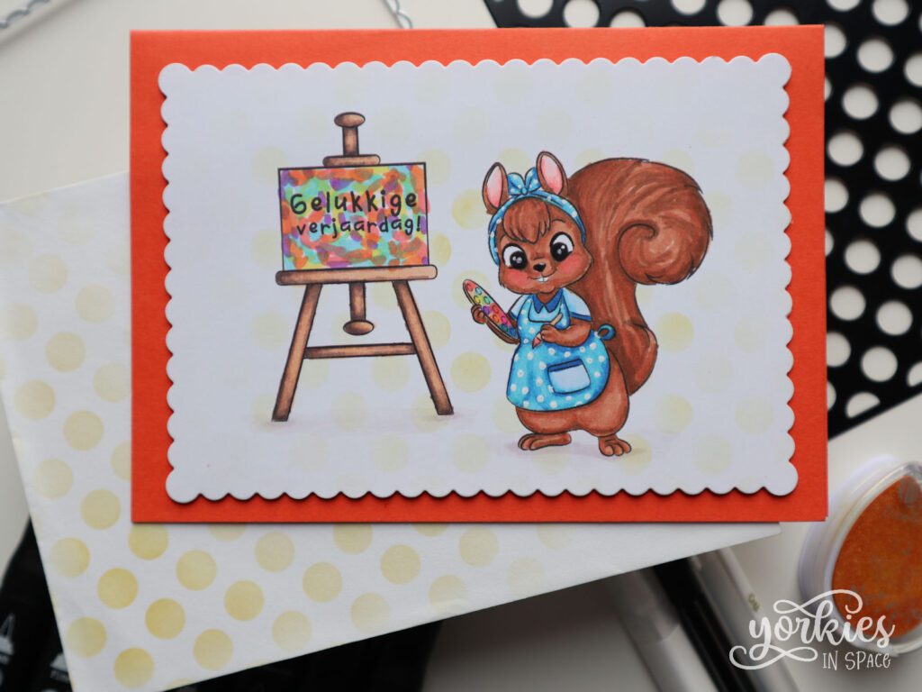 In Word maakte ik een compositie met de twee tekeningen. In plaats van het tekstje dat er bij zit te gebruiken, zette ik een “Gelukkige verjaardag!” op de schildersezel. Ik kleurde de afbeelding in met Décotime markers, voegde bolletjes toe in de achtergrond met een stencil en sneed het paneel ten slotte uit om op een oranje kaart te plakken. Leuk extraatje: ik gebruikte de stencil ook op een envelop, dat maakt je post net iets leuker!