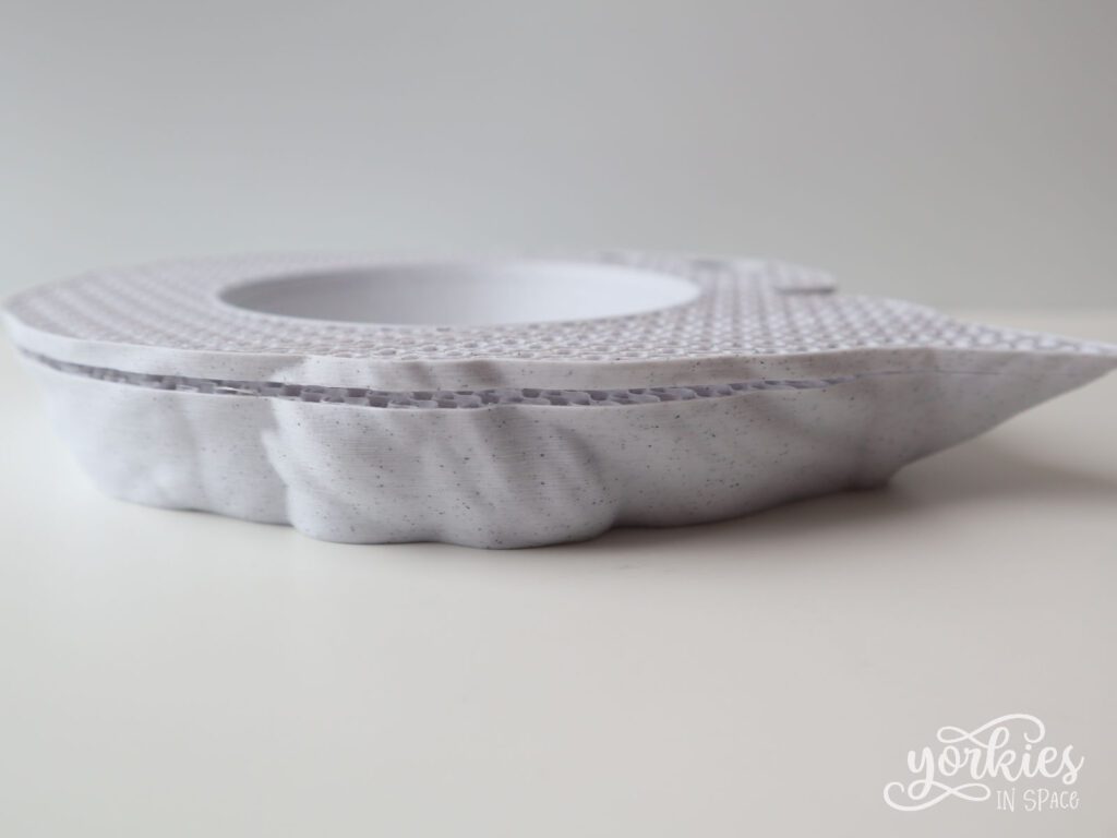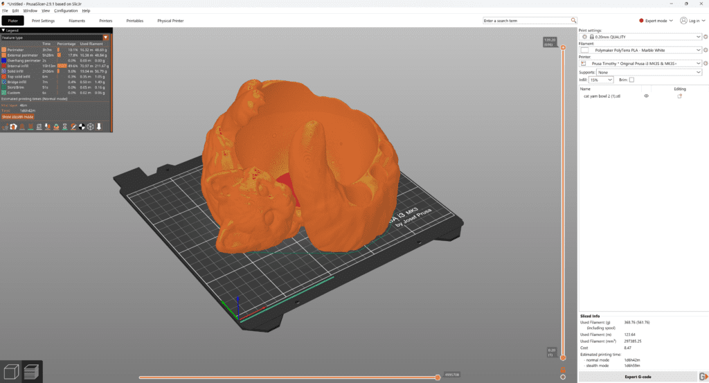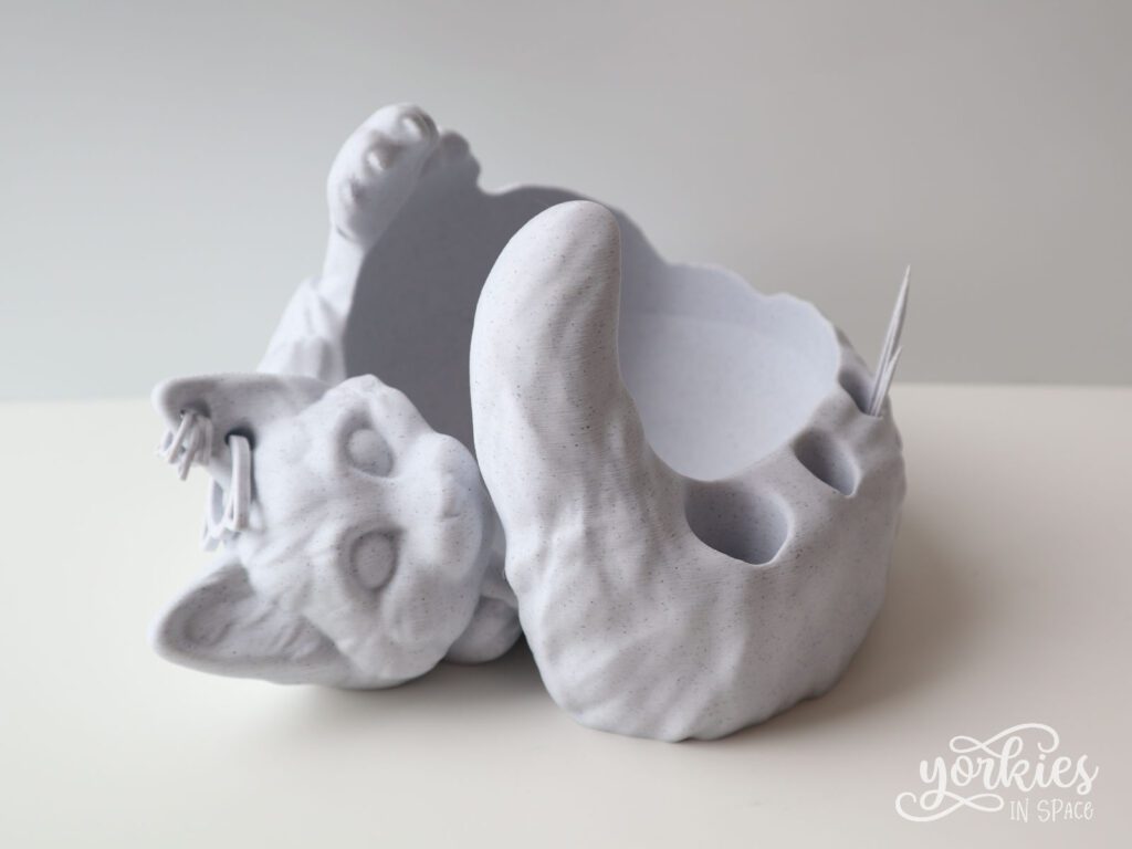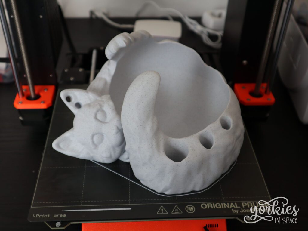 Voor de eerste print koos ik meteen voor een model dat véél tijd nodig had. Ik had namelijk deze mooie yarn bowl gevonden in de vorm van een kat en vond dit echt een leuk cadeautje voor mijn mama. Ik had misschien beter eerst voor een kleiner model gekozen, want dit model heeft meer dan een dag nodig om te printen! Aan de andere kant is dit wel een goed model voor beginners, omdat je geen extra instellingen zoals supports nodig hebt om een mooie print te krijgen. Voor het filament koos ik voor Polymaker PolyTerra PLA Marble White. Dit is een wit filament met een spikkel in, wat een marmer-achtige look heeft.