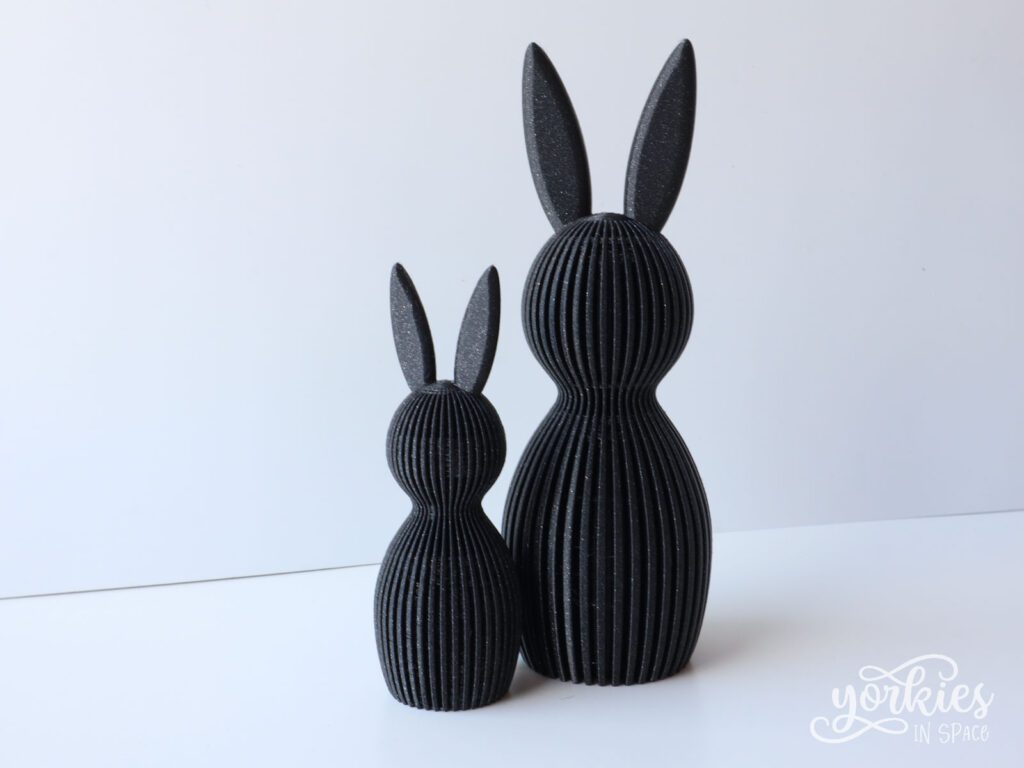 Het eerste konijntje printte ik op de ware grootte. Het resultaat was schattig, maar ik vond het een beetje klein. Dus printte ik nog een tweede op schaal 150%. Beide konijntjes zijn zonder supports geprint. Het gebruikte filament is Prusament Galaxy Black, een eerder prijzig filament omdat het helemaal van Tsjechië moet komen, maar het print wel ongelooflijk mooi. In totaal duurde het ongeveer 18 uur om de konijntjes te printen! Natuurlijk had ik een beetje tijd kunnen gespaard hebben door ze tegelijk te printen.
