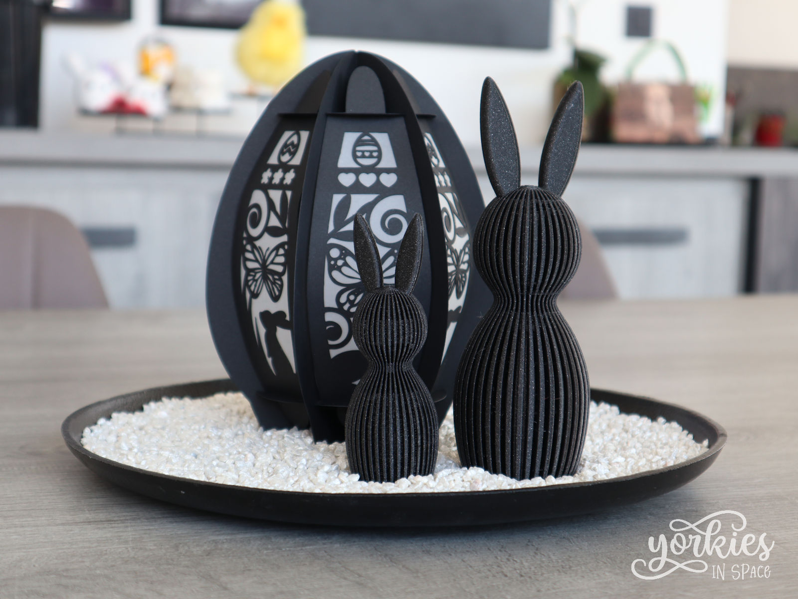 Om te decoreren combineerde ik de konijntjes met deze paaslantaarn in een schaaltje met decoratieve steentjes. Een ander leuk idee is om nog een derde grotere konijn te printen, of om er drie van hetzelfde formaat te printen om naast elkaar te zetten. Wat ook leuk zou zijn is het konijn een strikje geven, of een pompom als staartje.
