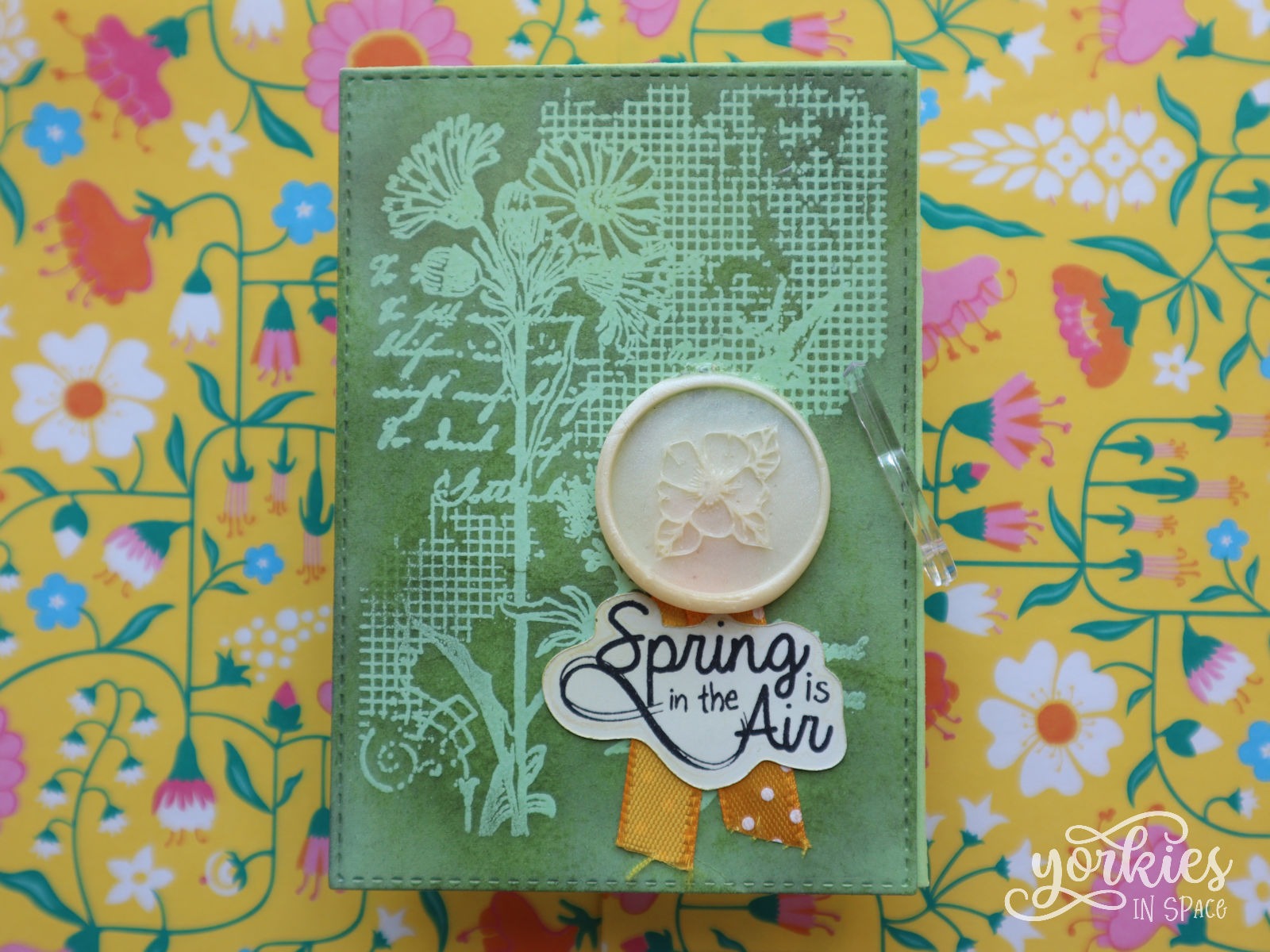 Het leek me leuk om op elk blad een “lenteding” te doen, maar ik had niet superveel ideeën. Ik speelde een beetje ‘vals’: de voorkant is de cover, op het eerste blad kwam mijn persoonlijke boodschap en op de achterkant mijn yorkiesinspace-stempel. Zo moest ik nog maar voor vijf blaadjes iets bedenken. Het lukte me vier mooie dingen te bedenken: bloemetjes, vogeltjes, vlindertjes en het zonnetje dat schijnt. Allemaal dingen waar ik altijd naar uit kijk wanneer de lente er aan komt, maar helaas gaat dit seizoen altijd gepaard met een plot twist. Ik wist al van het begin dat ik diezelfde plot twist in de zine wilde: pollen. Want dat hoort er dus ook helaas bij. Het is soms moeilijk om van al dat moois te genieten door de frustratie heen! Ik vind dat ik dat redelijk goed kunnen vertalen heb in deze zine. (Tijdens het schrijven van deze blogpost lig ik trouwens ziek in bed… dat die pollen maar gauw terug weg zijn!)
