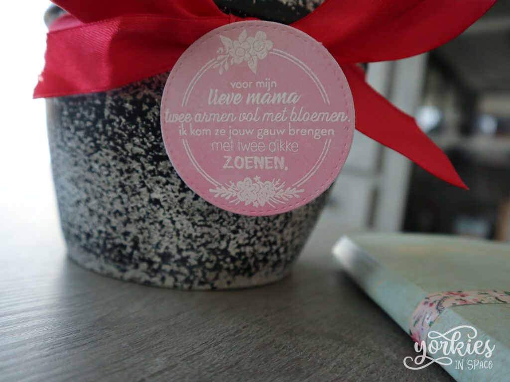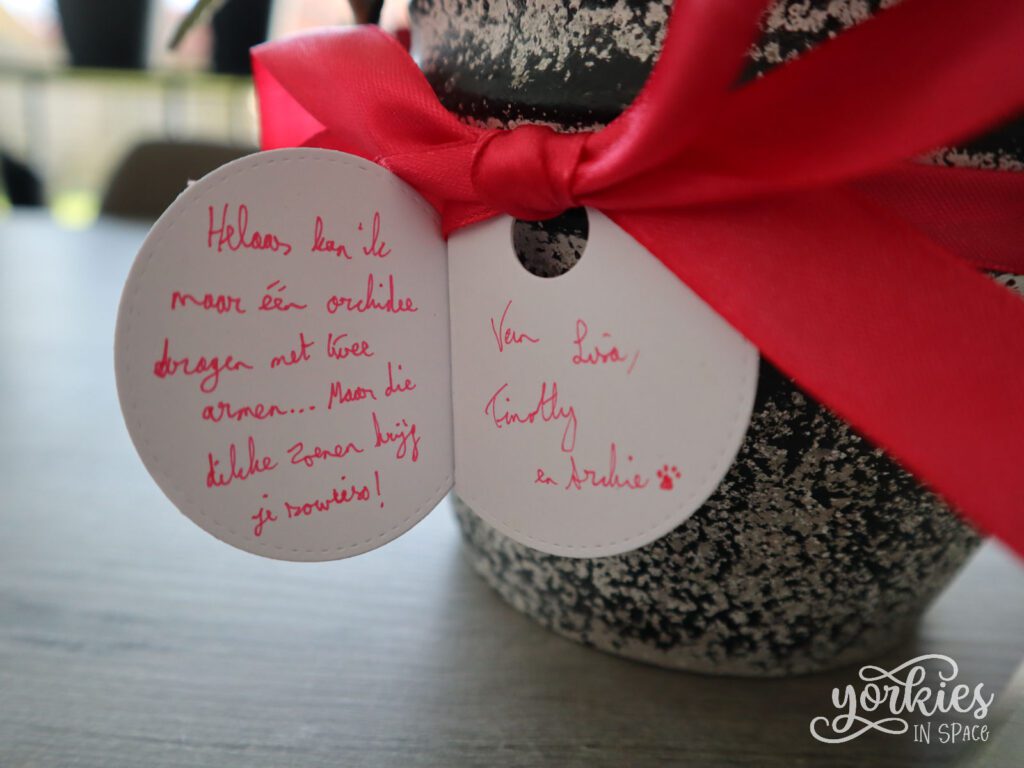 Een zelfgemaakt labeltje is natuurlijk altijd heel leuk. Ik vond deze stempel heel tof om te gebruiken, en zag ook meteen de gelegenheid voor een grapje aan de binnenkant. “Helaas kan ik maar één orchidee dragen met twee armen… Maar die dikke zoenen krijg je sowieso!”