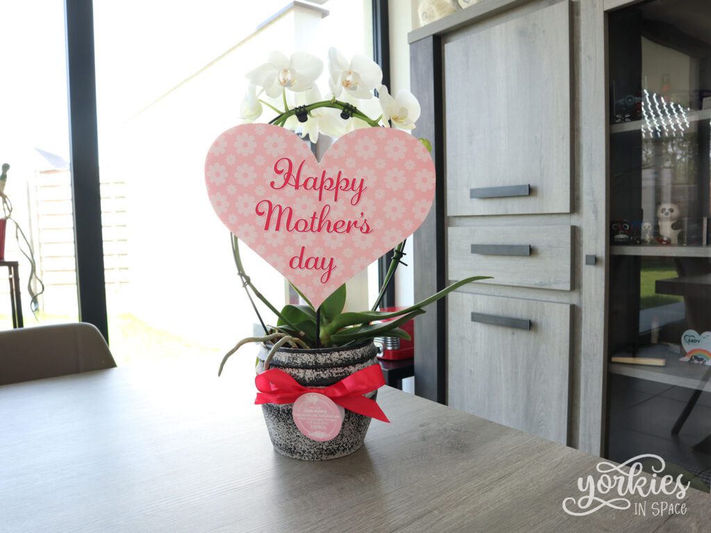 Persoonlijk geef ik liever een bloem in een pot dan een boeketje, omdat die langer meegaat. En mijn papa geeft altijd een boeketje voor Moederdag, dus zo krijgt mijn mama ze allebei! Ik koos voor deze orchidee omdat mama van orchideeën houdt, maar ook door het groot hart dat er bij zat. Dat hart heb ik er dus niet zelf aan toegevoegd, maar het is een eerste leuk idee! Je zou het gemakkelijk zelf kunnen maken: snij een groot hart uit papier en kleef op een brochettestokje. Op het hartje kun je het simpel houden met “Vrolijk Moederdag”, of je kunt een gedichtje schrijven of een tekening maken.