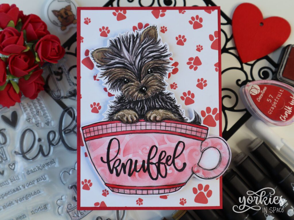 Ik drukte de digi redelijk groot af, zodat ik met veel detail kon kleuren, en sneed hem uit met de ScanNCut. De haren van de yorkie vind ik zelf eigenlijk echt goed gelukt! De yorkie zelf kleurde ik in met Décotime twinmarkers. Op de tas stempelde ik de tekst “knuffel” en gebruikte clear embossing poeder. Zo wreef ik de tekst niet uit bij het kleuren van de tas. De tas deed ik met inkt blenden en een stencil voor wat extra textuur. Met wat foamtape kleefde ik de tekening op een zelfgemaakt patroonpapier met pootafdrukjes, en dat dan op een rode kaart.