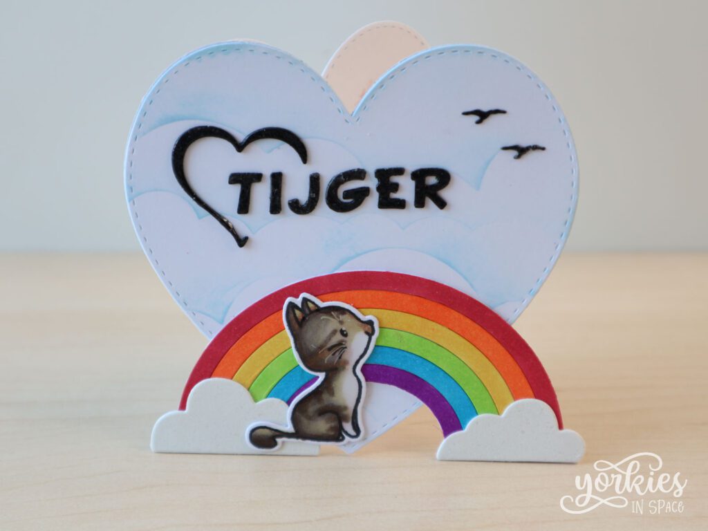 Ik maakte een kaartje voor mijn ouders en broer, en een tweede exemplaar voor mezelf. Ik wilde iets dat we kunnen uitzetten om Tijger te herdenken. Ik probeerde zo goed mogelijk zijn kleuren vast te leggen, en liet hem bij een regenboog zitten. Rustig en gelukkig, aan het genieten van de vogeltjes. Aan de binnenkant gebruikte ik zijn pootafdrukje, met de simpele tekst “voor altijd in ons hart”. Ik vond dat er niet meer nodig was dan dat.
