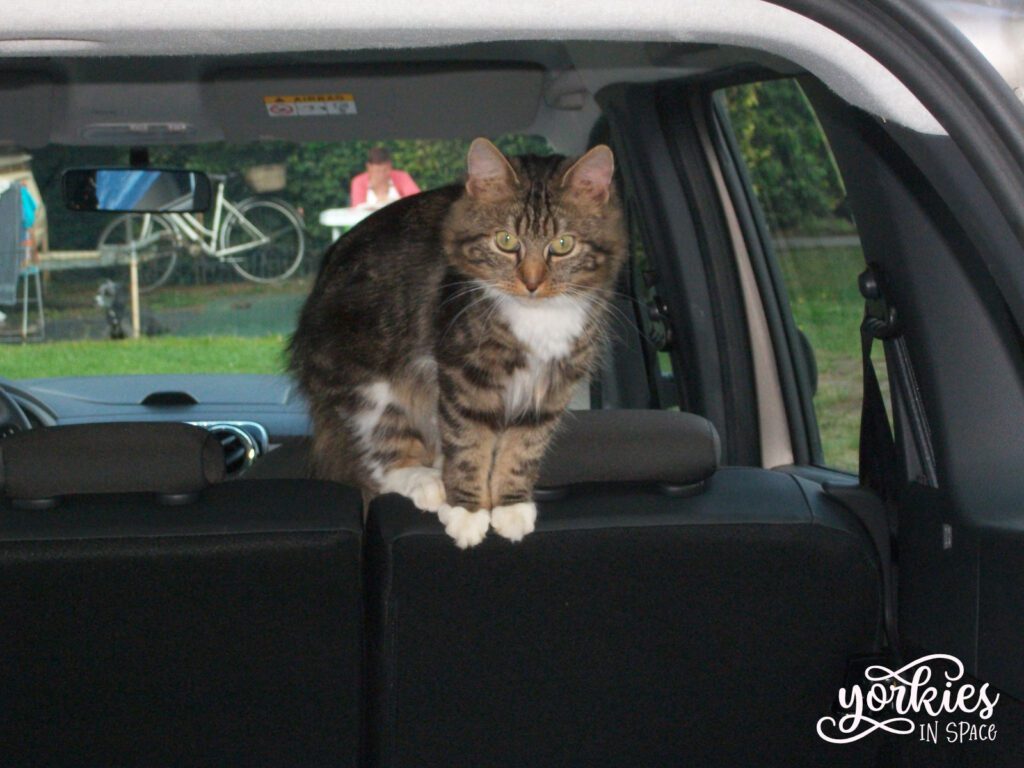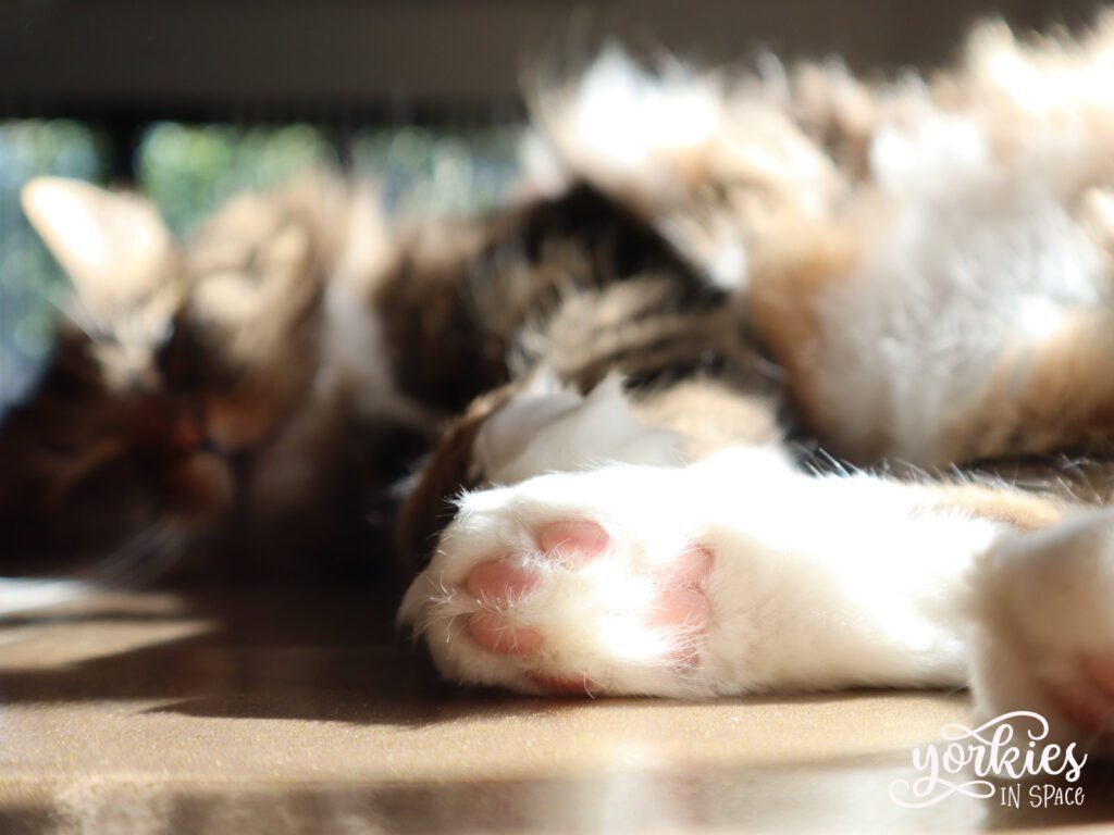 Met Archie was hij veel voorzichtiger dan met ons. Met mensen had Tijger weinig geduld, en ging hij niet aarzelen om eens zijn tanden of nagels te laten voelen als iets hem te veel werd. Maar met hondjes was hij supervoorzichtig. Hij kende Archie al van puppy af, en Archie kende geen vrees. Archie was een heel intense puppy – en is nog steeds vrij intens – en wilde liefst spelen met Tijger. Gelukkig had Tijger veel geduld met Archie en zocht hij simpelweg hoogtes op wanneer het hem te veel werd. Met de tijd ontwikkelden ze een traditie, waarbij Archie rechtstreeks op Tijger afliep om hem likjes te geven. Tijger sloot simpelweg zijn ogen, trok zijn kop wat in en zette zich schrap toen hij Archie zag komen aflopen, hij legde zich neer bij zijn lot en liet Archie zijn enthousiaste likjes geven. Tijger zijn kopje was dus vaak helemaal nat toen Archie op bezoek kwam!