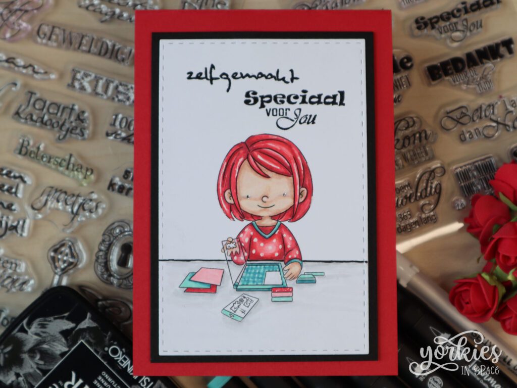 Ik ging dus aan de slag voor een last-minute kaartje en blogpost. Daarom moest ik het wel simpel houden. Ik drukte de digistamp groot af zodat ze redelijk veel van de kaart inneemt. Dan kleurde ik haar in, stempelde een sentiment en maakte het net iets meer bijzonder met laagjes.