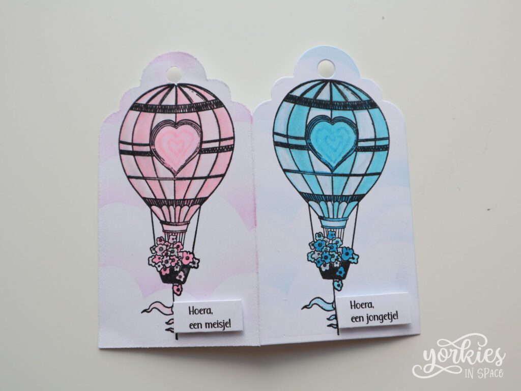Het labeltje is eigenlijk een mini-kaartje, zodat ik er vanbinnen een boodschap kon schrijven. Aan de ene kant is alles roze, met de tekst “Hoera, een meisje!” en aan de andere kant is alles blauw, met de tekst “Hoera, een jongetje!”.