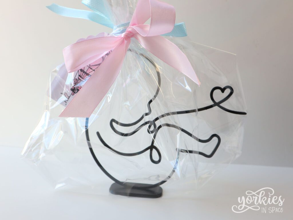 Het cadeautje was de baby wire art die ik eerder deze week met jullie deelde. Ik pakte het in met doorzichtige folie, en trok het thema van roze-en-blauw helemaal door. Aan de ene kant maakte ik een roze strik, en aan de andere kant een blauwe strik. Zo kun je het cadeautje naar de juiste kant draaien eens de gender reveal gebeurd is!
