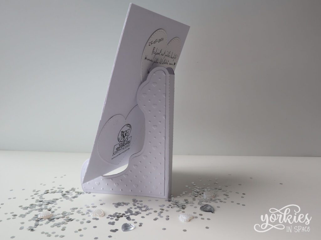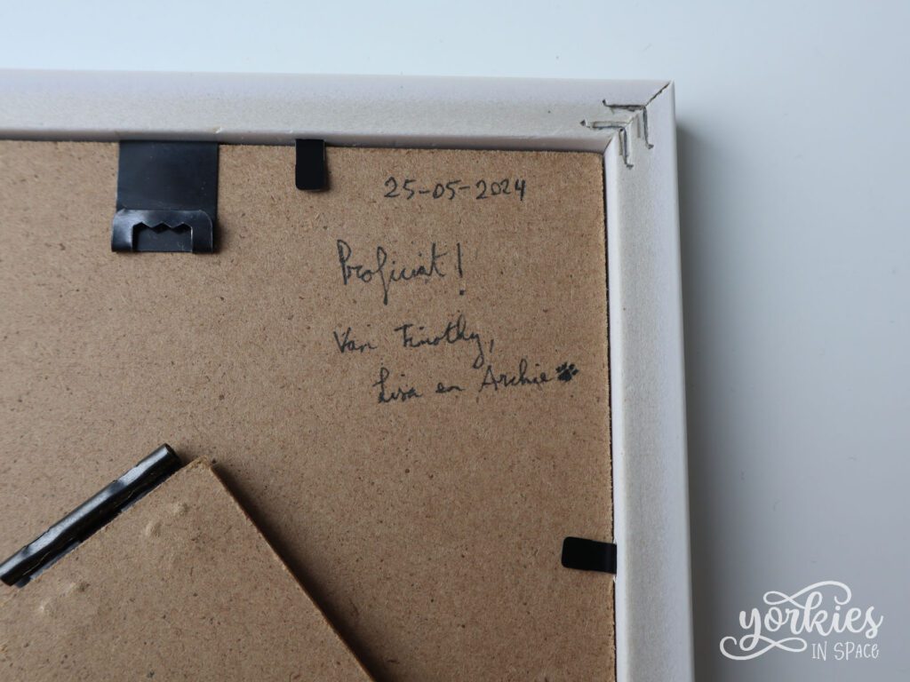 Achteraan in het kader verstopte ik nog een extraatje. Ik wilde graag de optie open houden voor het koppel om het ‘kaartje’ uit het kader te halen, dus had ik nog iets nodig om het kaartje mee recht te zetten.