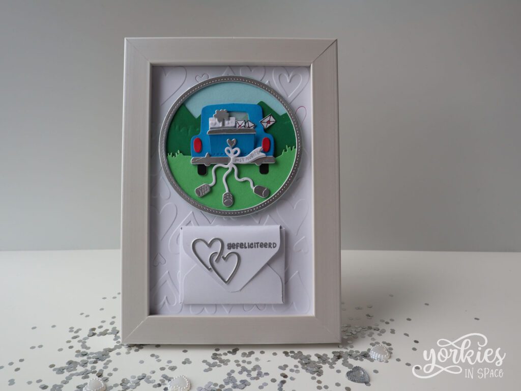 De focus van het ‘kaartje’ is een klassieke auto met blikjes erachter aan. Ik vond het een leuke keuze voor dit koppel omdat ze met de auto op huwelijksreis zouden vertrekken. Ik voegde ook een klein envelopje toe waar we de centjes in staken.