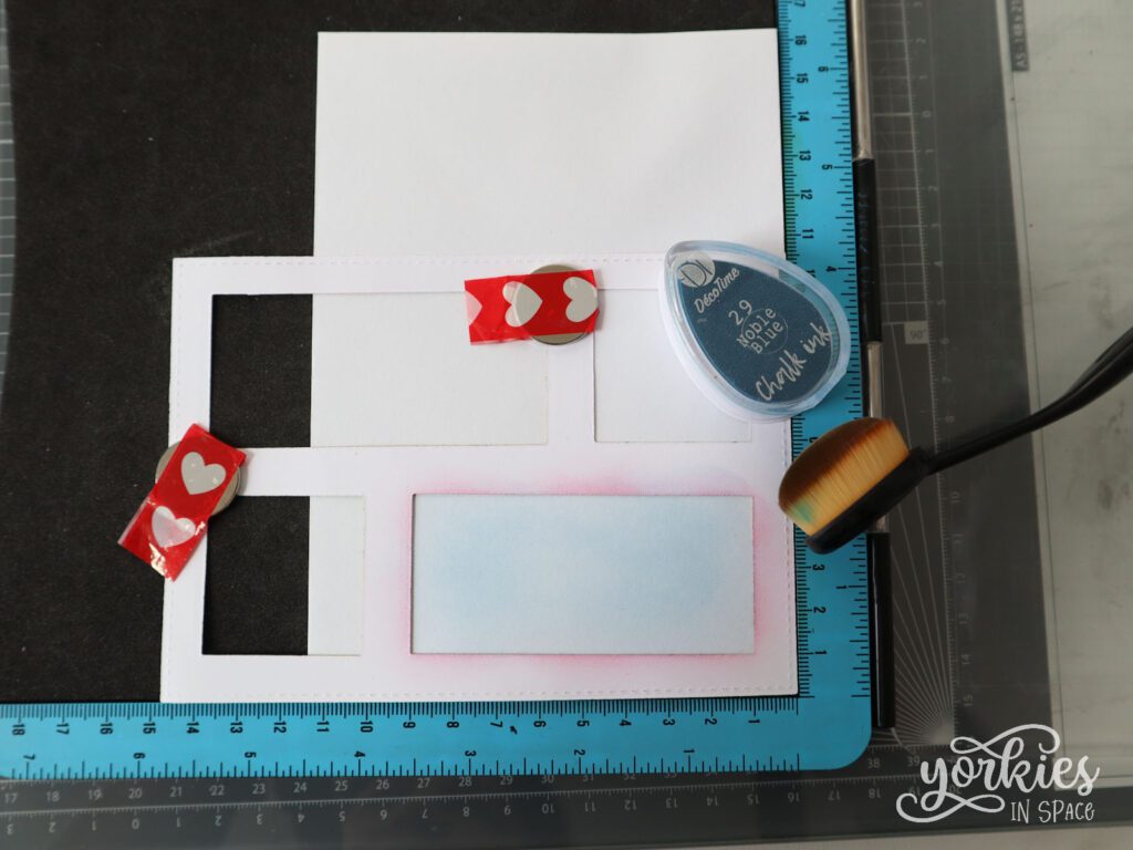 Ik gebruikte voor alle kaartjes dezelfde techniek met een zelfgemaakte stencil. Deze demonstreerde ik al eerder in deze post. Op die manier passen ze allemaal samen in één setje! Ook de envelopjes versierde ik mee, dat deed ik door één rechthoek van de stencil te inktblenden en daar een stempel bovenop te gebruiken. Voor het uitlijnen van de stencil gebruikte ik mijn stempelhulp. Het kan geen kwaad als de stempel hier uitsteekt, dat vind ik juist heel tof.
