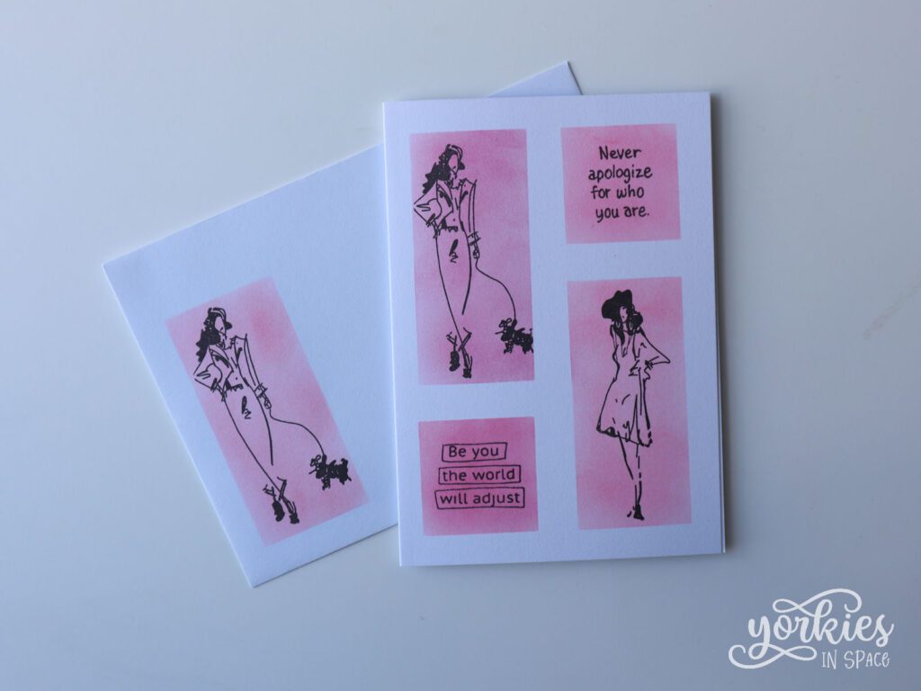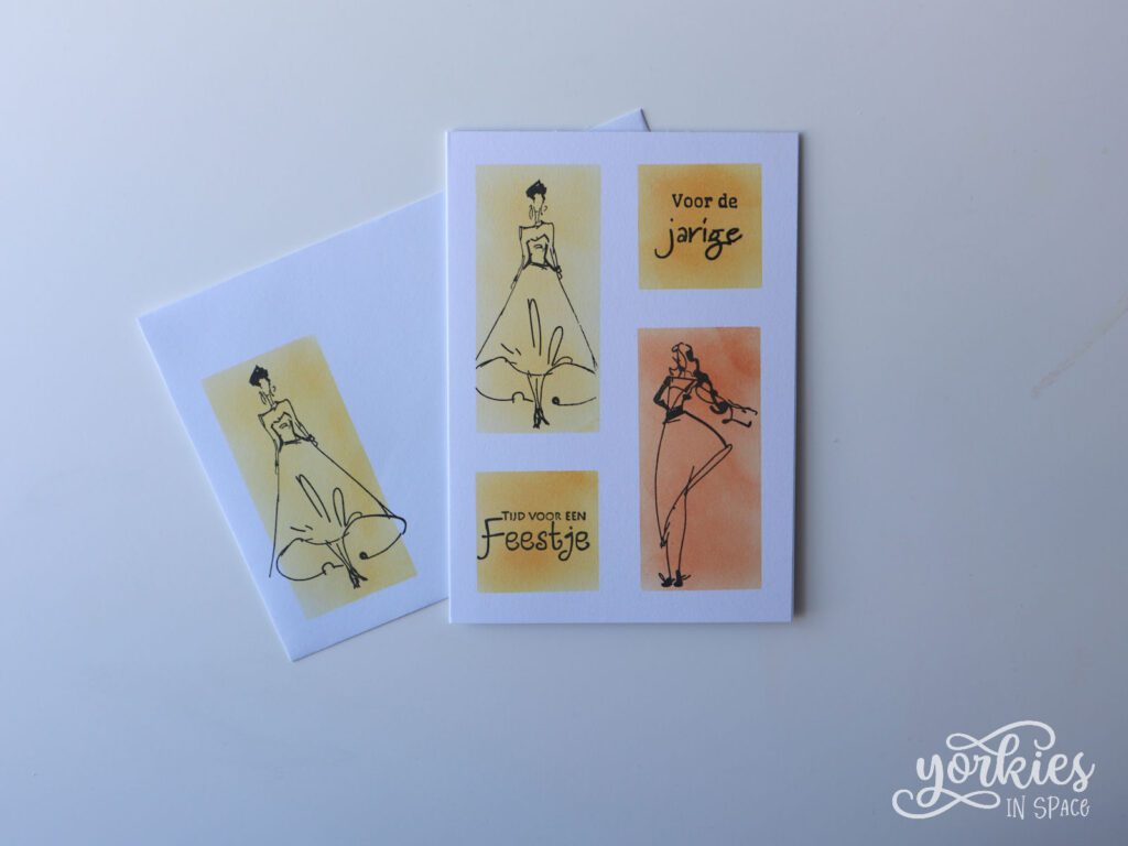 In de grote rechthoeken stempelde ik twee van de modieuze dames, en in de kleine telkens een sentiment. Zo maak je snel een leuke verjaardagskaart.