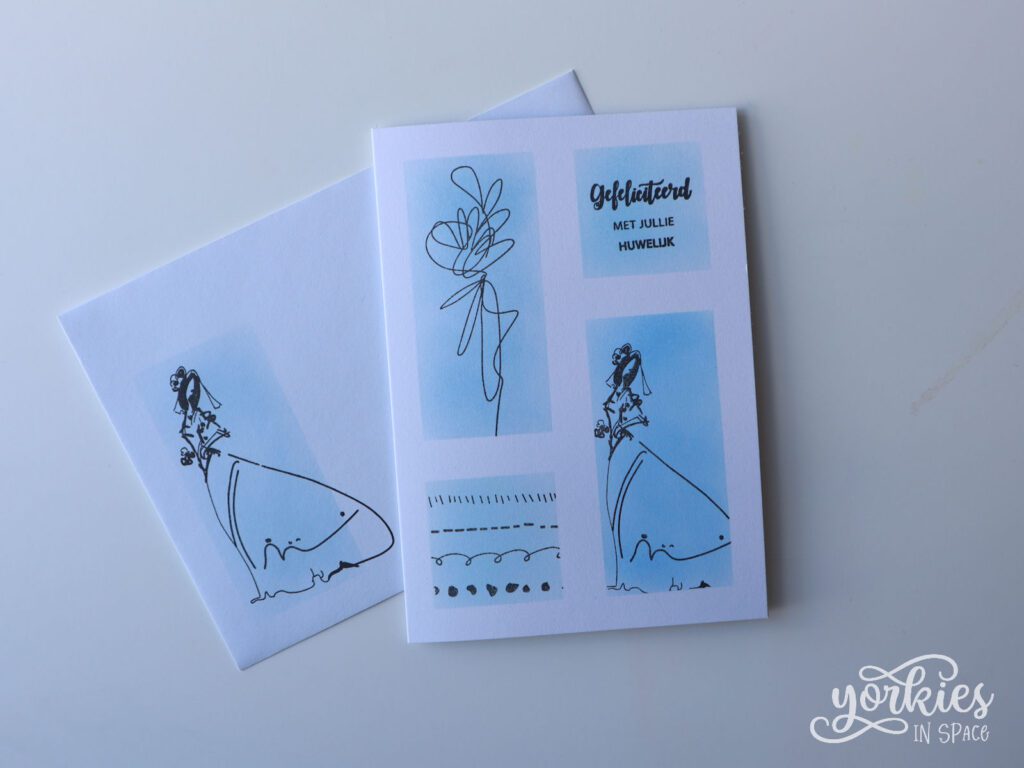 Voor dit kaartje hield ik het bij één dame, namelijk de bruid. De andere grote rechthoek vulde ik op met scribbles. Op de kaart zorgde ik ervoor dat de stempel binnen de stencil bleef, maar op de envelop liet ik haar kleed buiten de stencil lopen voor een ander effect.
