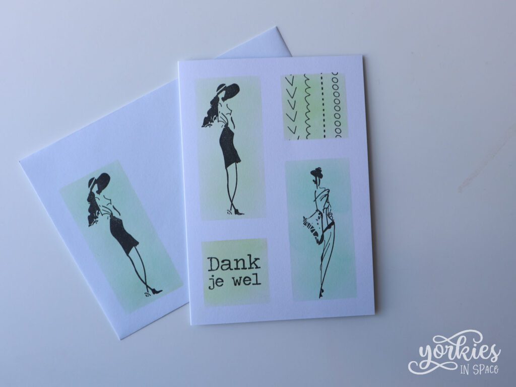 Deze twee dames vond ik een frisse combinatie met groen. Ik besloot er een bedanktkaartje van te maken. Het andere vierkant vulde ik in met wat doodles.