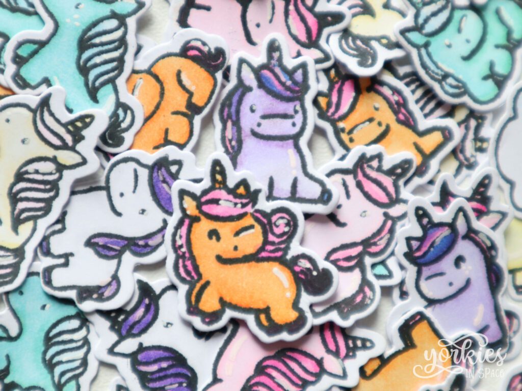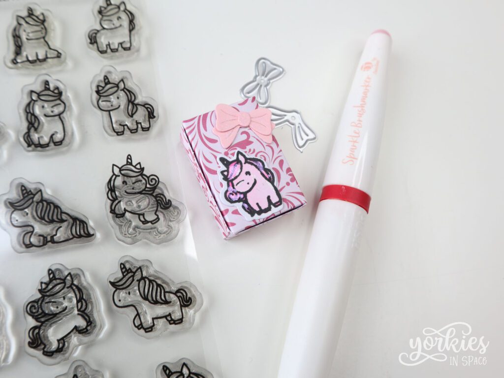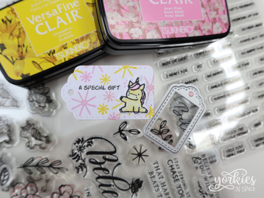 Een leuk cadeaulabeltje is heel snel gemaakt met deze kleine cuties, zeker als je al wat eenhoorns op voorraad hebt! Ik stempelde wat sterretjes in de achtergrond, maar je kunt ook gewoon een tekstje stempelen en een eenhoorn kleven. Meer heeft zo’n labeltje eigenlijk niet nodig.
