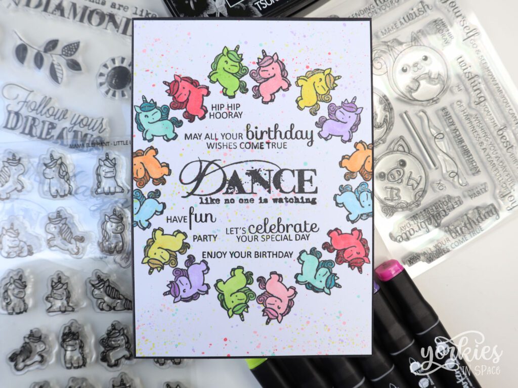 Waarom niet een krans maken van eenhoorns? Ik nam twee eenhoorns die leken te dansen en maakte er een leuke krans mee met de Stamp&Spin. Tijdens het inkleuren van de eenhoorns maakte ik per ongeluk wat spetters op de kaart. Ik besloot om maar gewoon mee te gaan met de flow en maakte een heleboel spetters met de stiften!