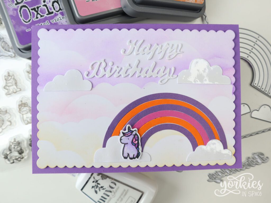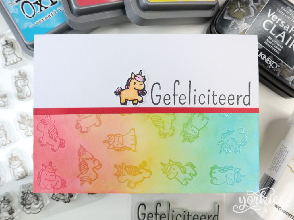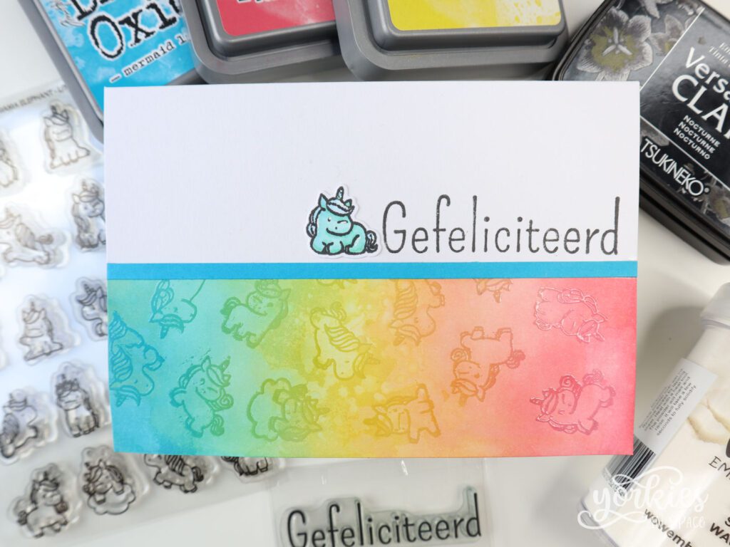 Het leek me ook leuk om een eenhoornpatroonpapiertje te maken. Met Distress Oxide maakte ik een regenboogachtergrond. Daarop stempelde ik de eenhoorns en gebruikte clear embossing poeder om de kleur vast te zetten. Daarna maakte ik het paneel nat en lifte de kleur op een ander paneel. Zo krijg je het effect dat de eenhoorns iets donkerder zijn dan de achtergrond. Ik maakte er meteen twee kaartjes mee.