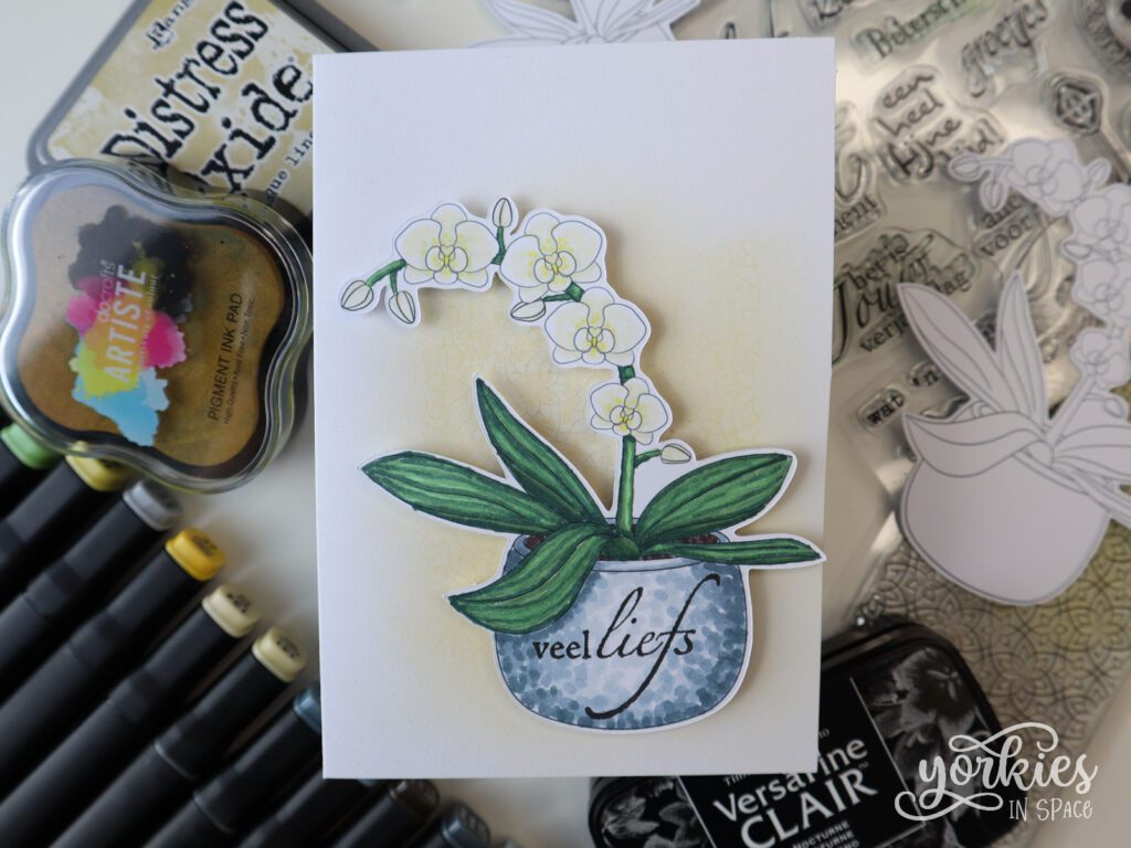 Als voorbeeld maakte ik een simpel moederdagkaartje waarbij de orchidee centraal staat. Ik liet de ScanNCut hem uitsnijden – want zo mooi knippen kan ik zelf helemaal niet! – en kleurde die in met Décotime alcoholstiften. Ik koos voor de eerder klassieke witte orchidee. Op de pot stempelde ik een tekstje. Ter afwerking deed ik wat inkt blenden en stempelen voor een simpele achtergrond, en kleefde daar de orchidee op met foamtape.